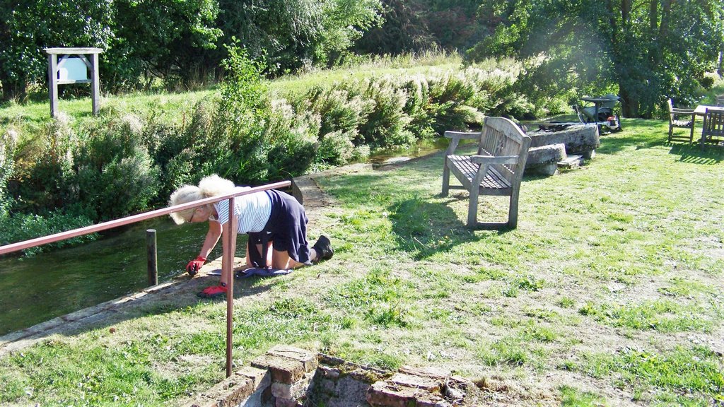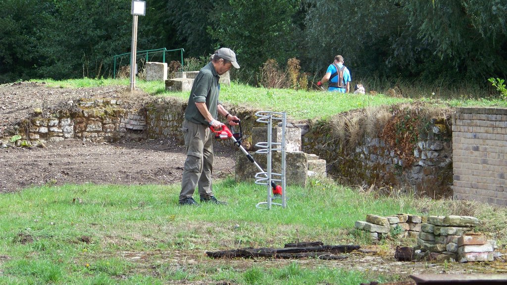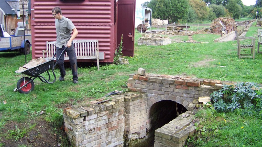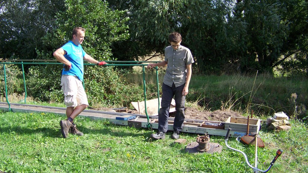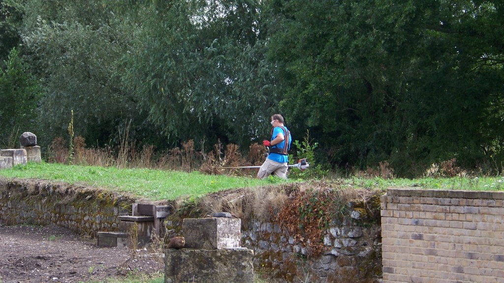 Ryan cleared rubble and debris from the downstream tunnel, took it back and tipped it in the yard and brought back water for making tea which we forgot to bring. He then helped David take apart the swinging footbridge as it would not rotate, I went home and got a socket set so the seized bearing could be removed. Ryan and I then went back to get the mower so Eddie and David could cut the grass. We have not needed to mow since July due to the drought.