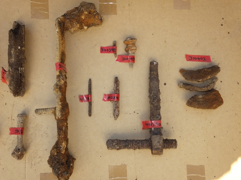 The metal detector was used near the recently uncovered brick floor at the upstream end of the building and finds included some nails, hinge post, coprolite, and various pieces of metal. Then the machinery area in front of the wheel was scanned and a large washer with keyway was found, a hinge post, plus large pieces of casting which could be from the gear wheel on the main shaft. The main trench was then scanned along its full length revealing a large bracket with bolt attached, bolt, bolt head, and towards the furnace end were large lumps of molten metal and slag.