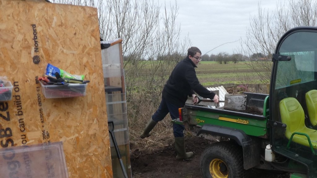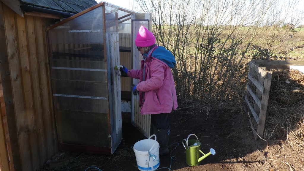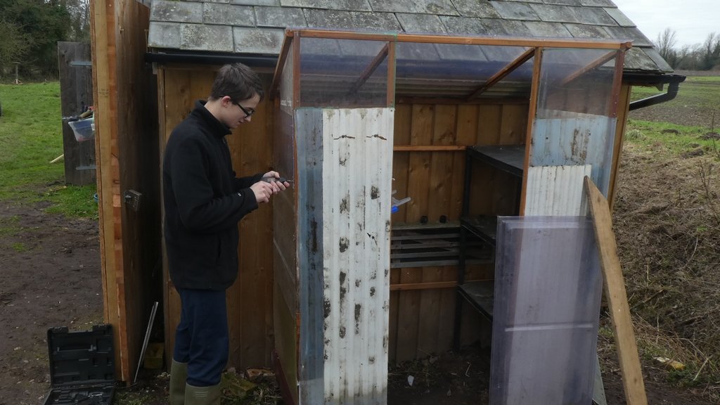 Saturday 4/2/23 Ryan changed the opaque end panel on the greenhouse for clear acrylic sheets so it gets more sun, he cut the panels to size and fitted them with a piece of wood at the bottom. Ryan then cleared soil away from the greenhouse doorway area which he took away to fill deep holes along the riverside track.