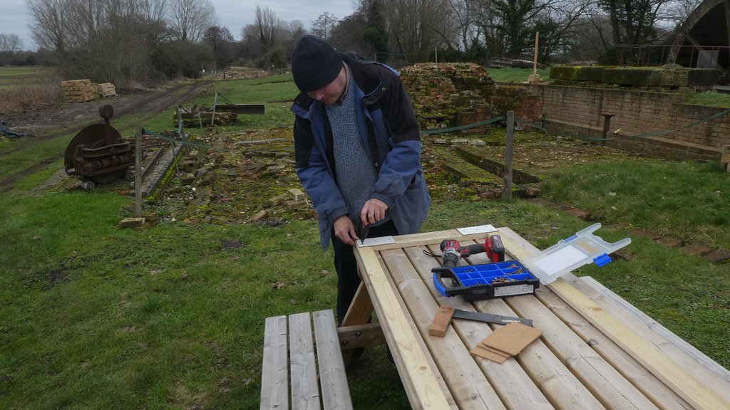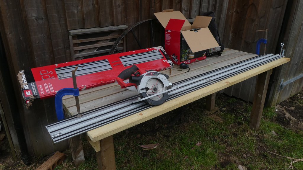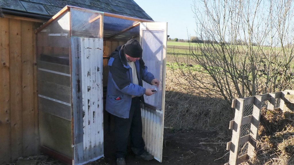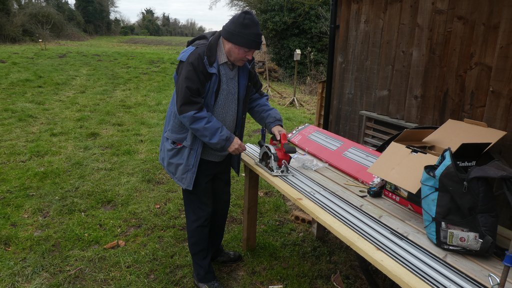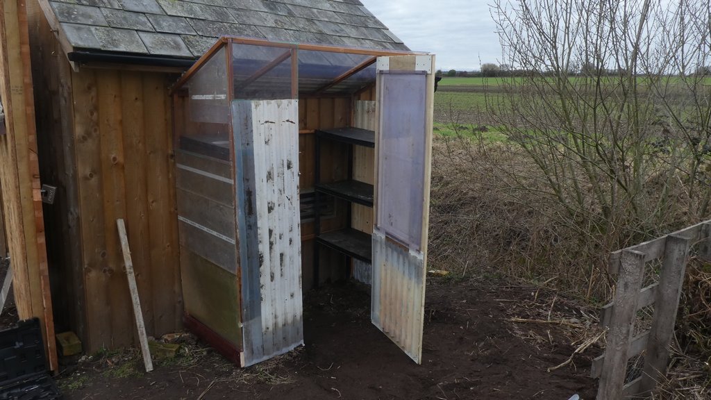 I brought my track saw and made a greenhouse door by splitting a plank of wood for the sides, cutting cross pieces and hardboard plates to hold the pieces together. Eddie’s old greenhouse panel and a piece of Corrolux were fitted into the door, plus hinges and a bolt, which completed the greenhouse.
