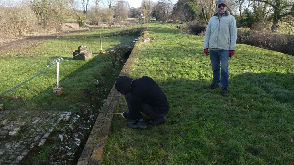 Eddie and I pegged out a line of cotton between the ends of the bowed trench wall and Ryan measured the distance to the wall which has reduced by 5mm, we think due to the cold temperature. We are monitoring the wall to see if its still moving.