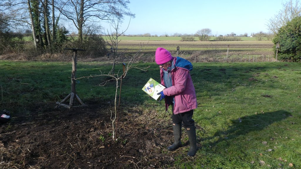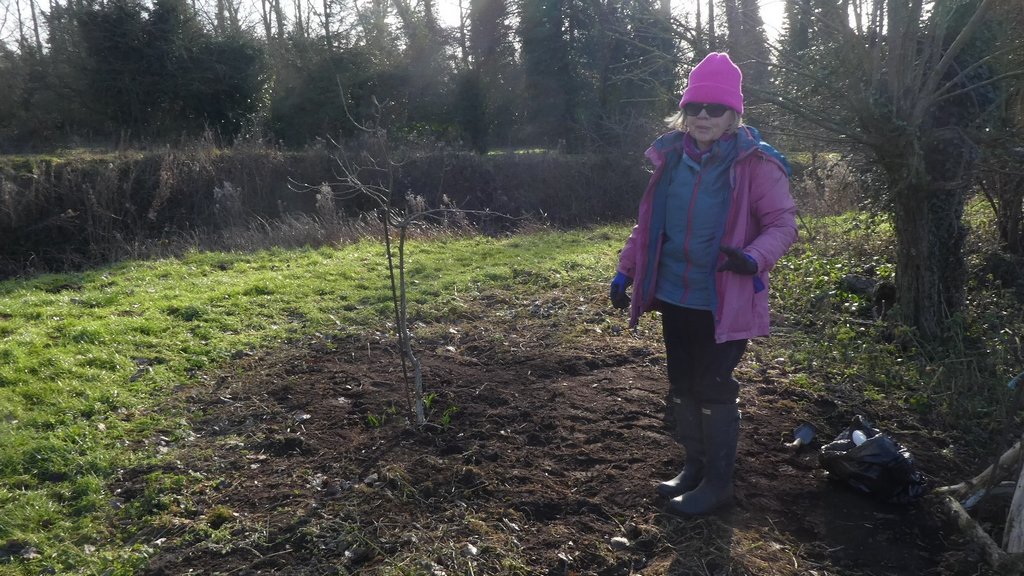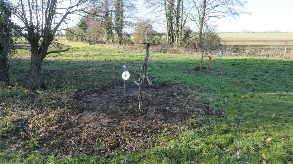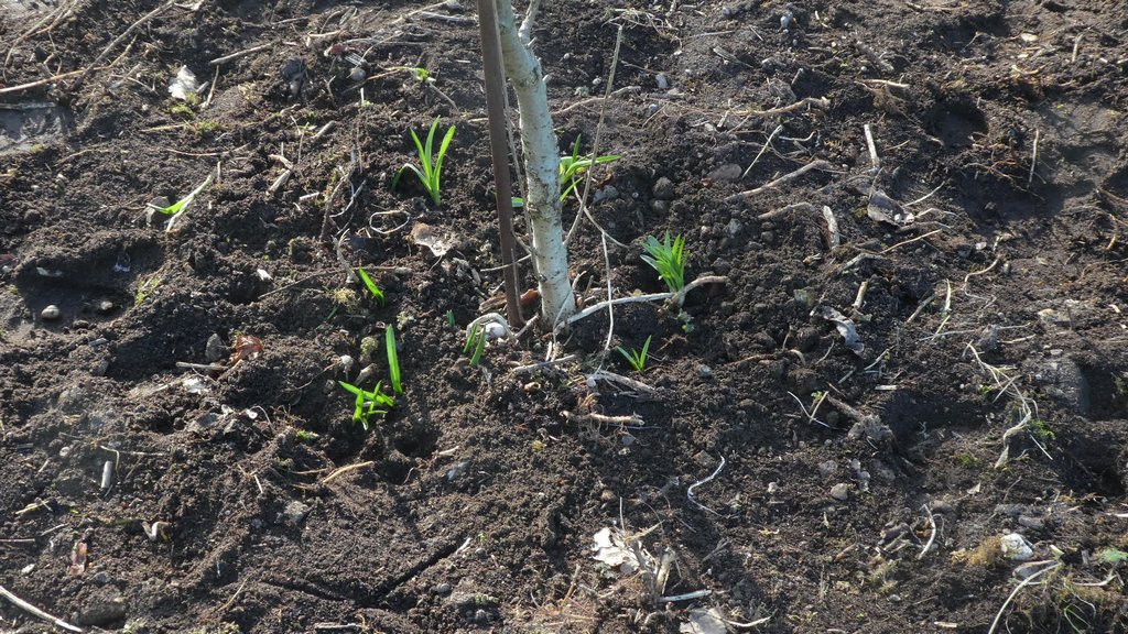 Anne Marie brought Snowdrops and planted them around the small Oak tree, then covered the area with grass seed. Ryan brought sticks with hanging CDs from the wildflower area to keep birds off the grass seed.
