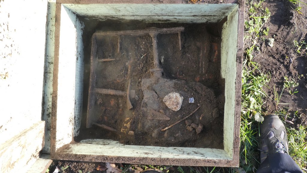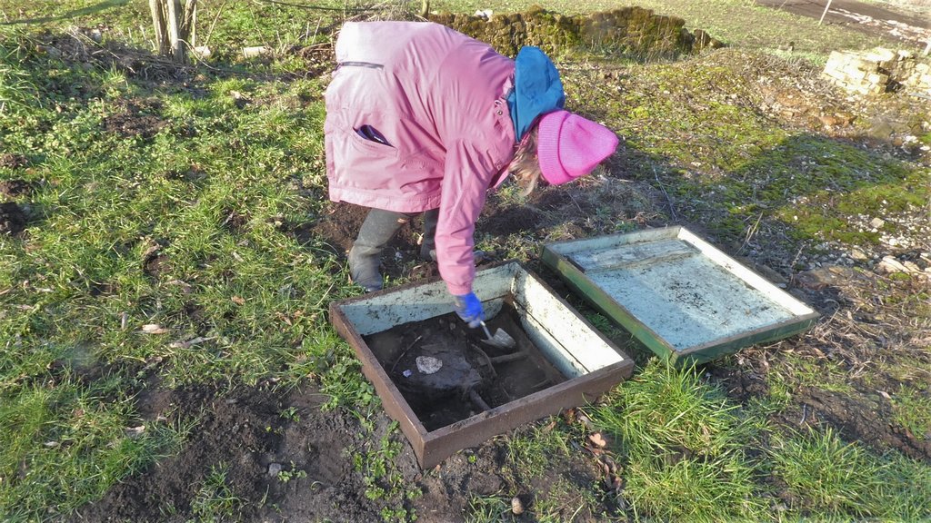 Anne Marie cleared soil away from the boiling house foundation as Moles had pushed soil up inside this feature again, the iron corner bracket can now be seen.