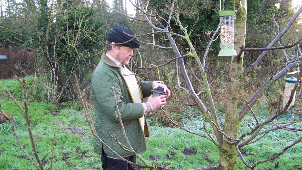 We filled up the bird food, the storm had blown the long seed feeder into the river, so I got a rake to fish it out and put it by the fire to dry. Eddie found another seed feeder on the ground, the string had broken so he repaired it, refilled it and hung it back in the tree. We saw Blue Tits eating peanuts straight away.