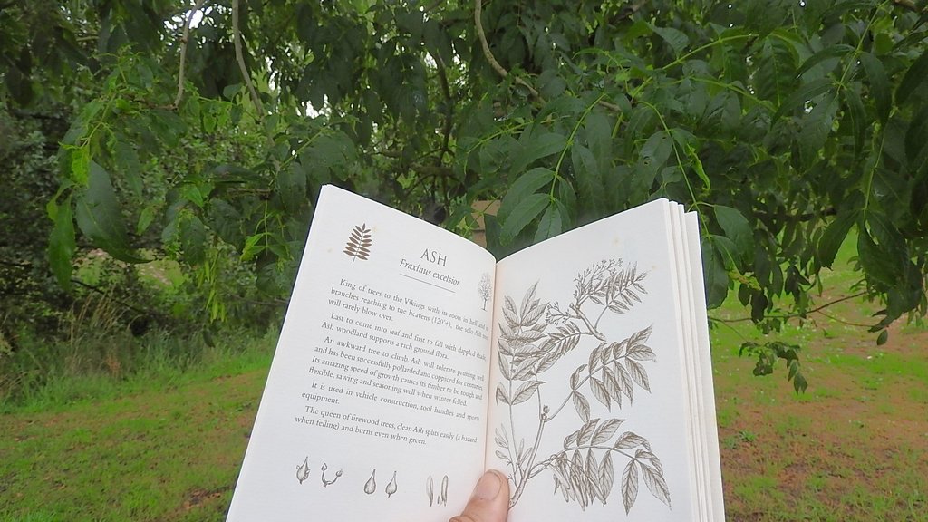 The rain eased off and Eddie cleared grass and weeds away from our oak saplings in the wildflower meadow to give them the best chance of survival. Eddie and I put the butterfly box we repaired last week back on the tree it came from. Eddie asked what type of tree it was, so we looked it up in the Native British Trees book that Anne Marie gave us recently, we identified it as an ash tree.