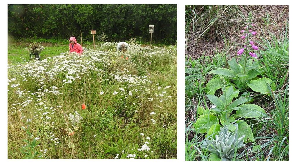 We all pulled up yarrow from the meadow as it has taken over and swamped the few flowers we have this year, this gives better views of the flowers. The recent rain has brought more poppies and cornflowers out on the sloping area. Cornflowers and foxgloves are flowering which Anne Marie planted recently. Marigolds are flowering in the new areas of the meadow created and sown in spring. Thistles have started flowering, we leave them as they look good and birds eat them after they go to seed.