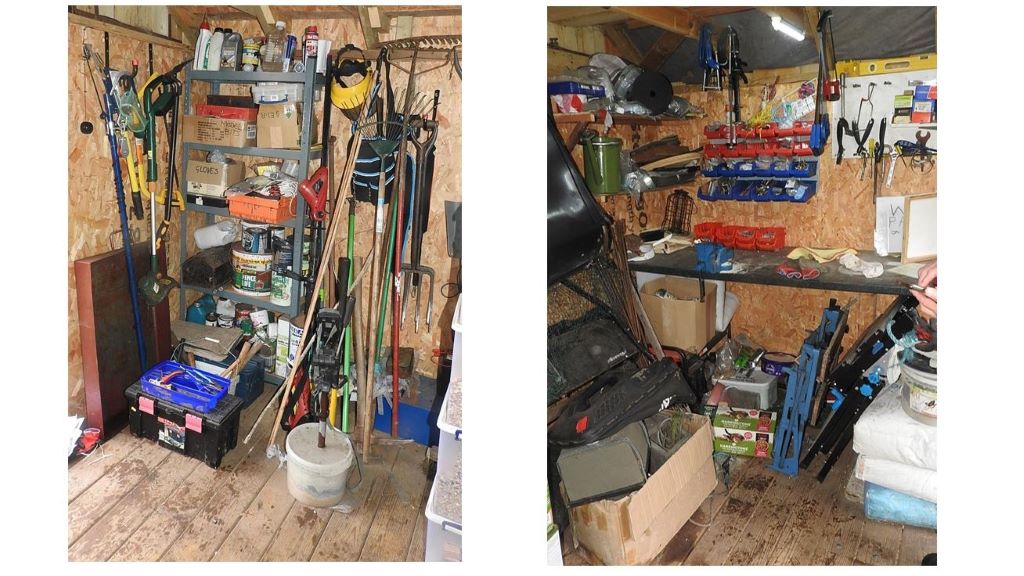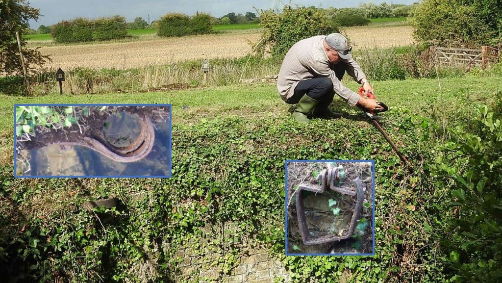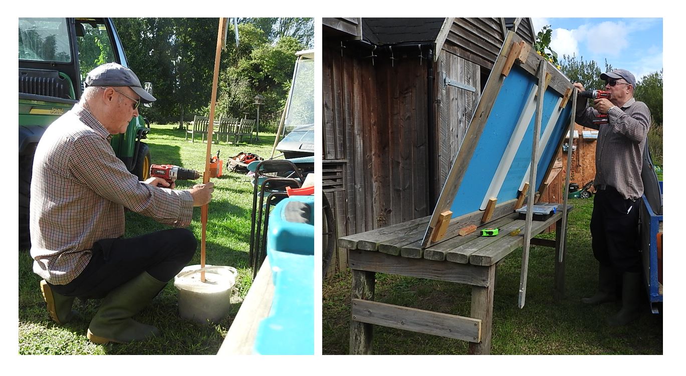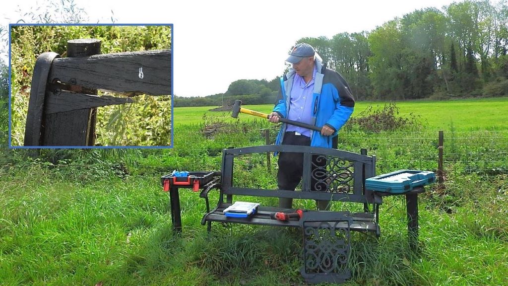 The back panel had fallen out as the frame had split apart. The top is fixed to a post in the ground, so I went back to get the sledgehammer and knocked the post in further which closed the gap allowing us to refit the panel with extra screws. It was difficult to get the bridge across as brambles had grown around it, so Eddie cut them down.