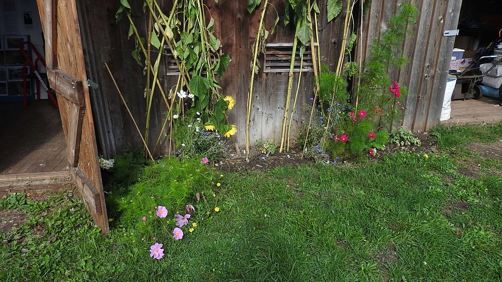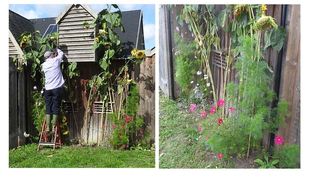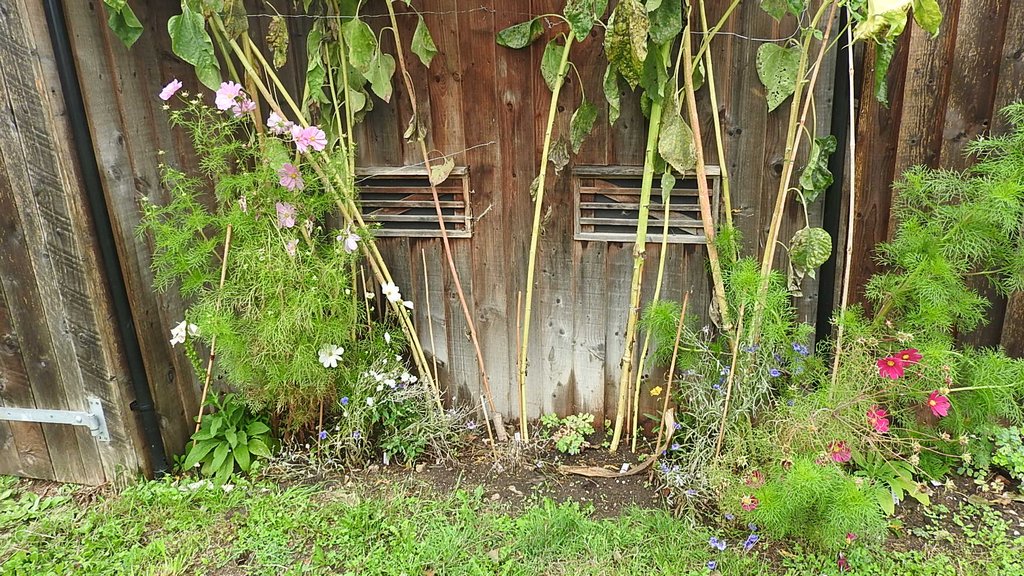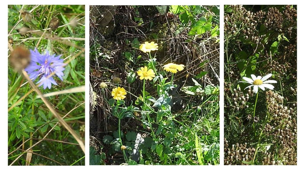 Sunflowers and cosmos had fallen over so we put in more staples and wires to hold them in place. On the wildflower meadow the only flowers left are a solitary cornflower, corn chamomile and a small patch of marigolds. We'll cut the meadow down soon.