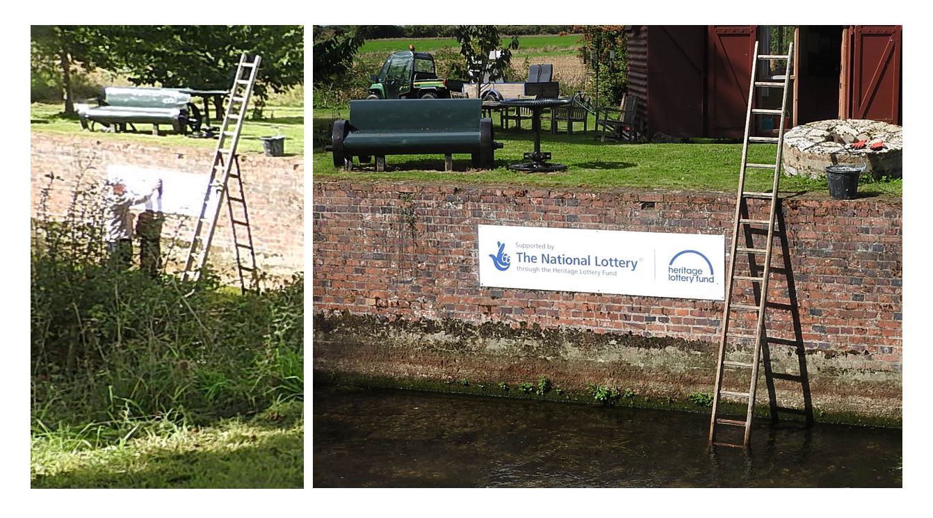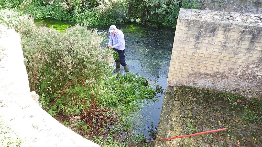 I went across to the brick pier next to the water wheel with a spade and scraped ivy off the wall, then went down the ladder into the river to clean the HLF sign on the river wall. I used our battery strimmer around the compost bay and wood store to clear nettles.