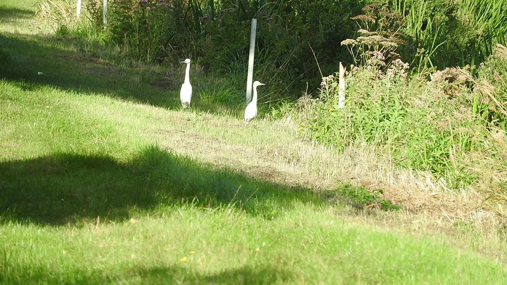 Thursday 18/9/25 I went to the mill in the afternoon and put the bridge across so Jan and Mary could cross over from their walk along the footpath to look around the mill, I put the screens on showing the water wheel turning, the model mill and meadow in flower. We had tea and biscuits outside, then Jan and Mary walked back to The Maltings, they saw a little egret and a heron.