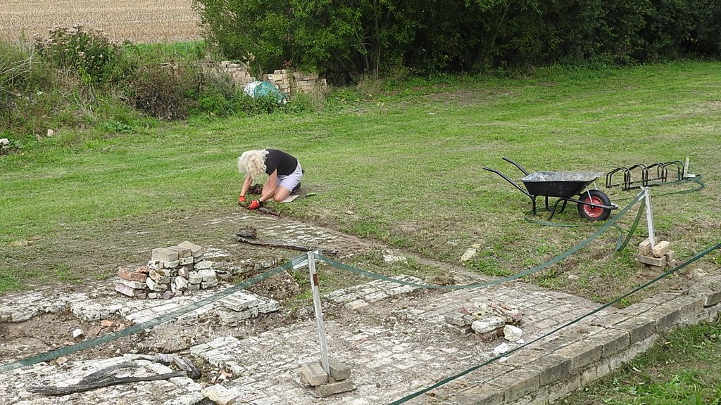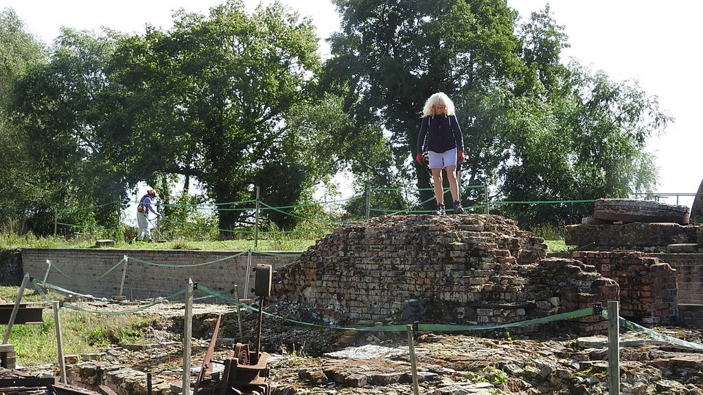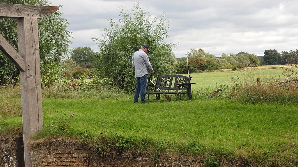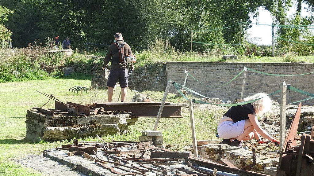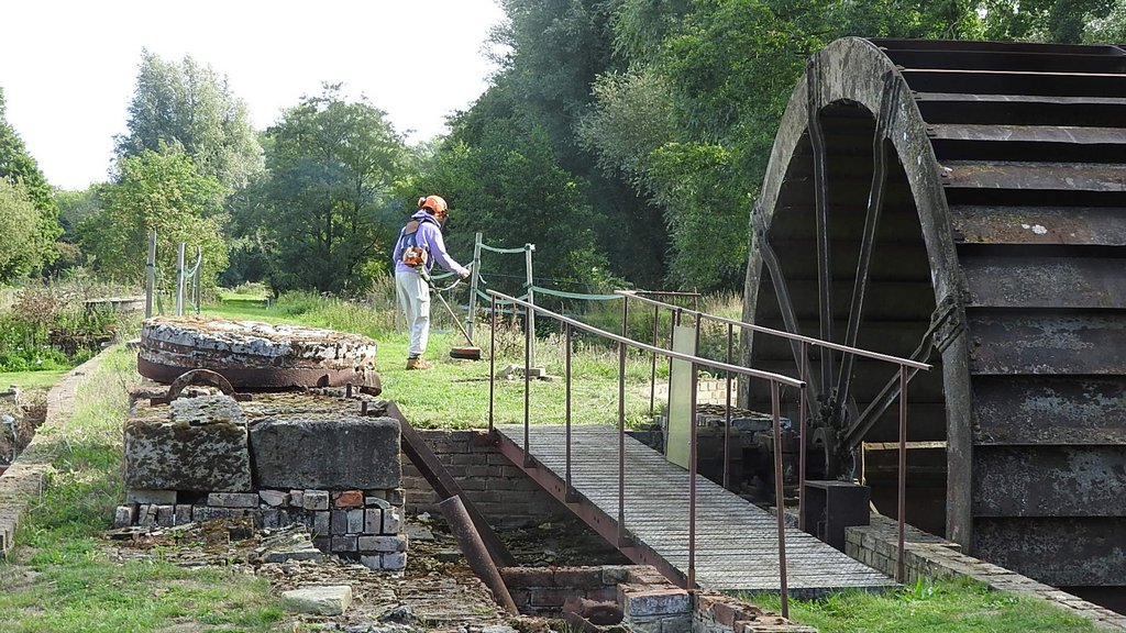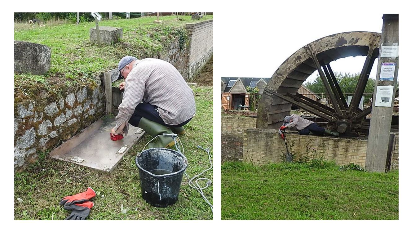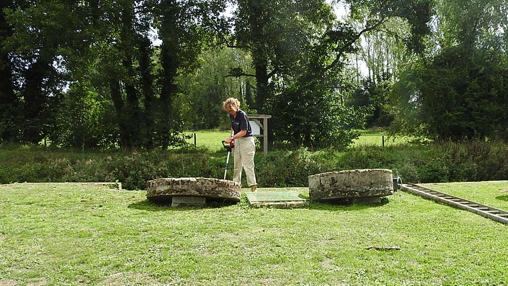 Fred also mowed the Nar Valley Way opposite the mill and cut grass between the wagon and river wall. Debra and David used petrol strimmers all around the site. Emma weeded the Hammer Mill, brick floor and Cistern and cooked fried egg rolls for our lunch which we had outside.