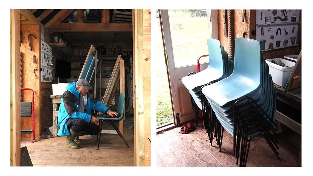 I went to the visitor centre and got finds to go with the 10 year anniversary and mill workers displays, I put them in a box with their labels. Eddie and I cleaned and dried the outdoor chairs and stacked them in the visitor centre.