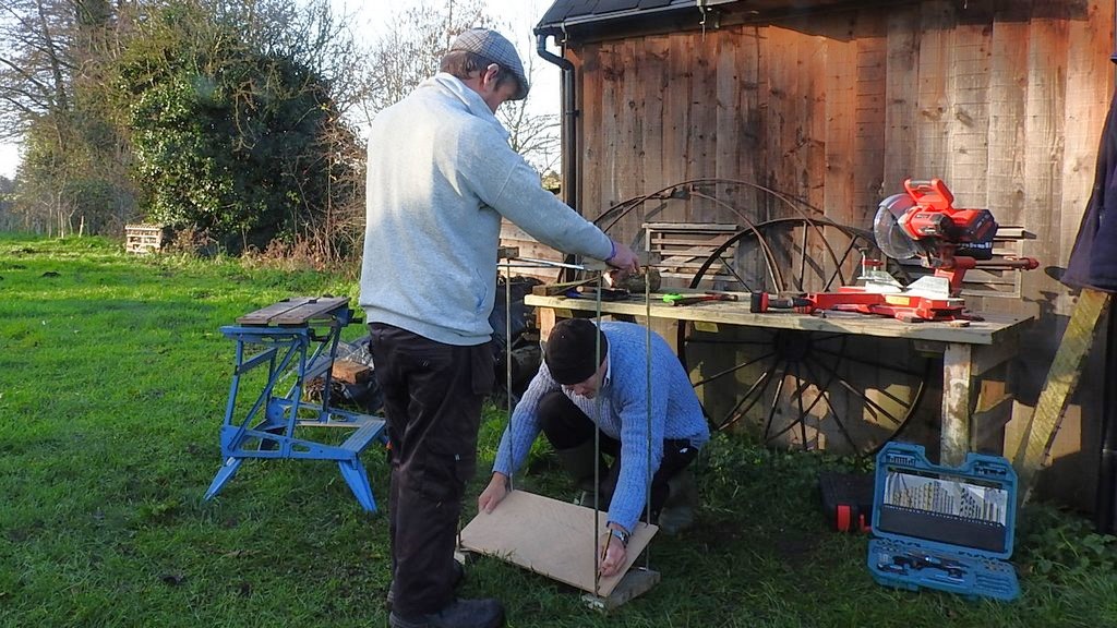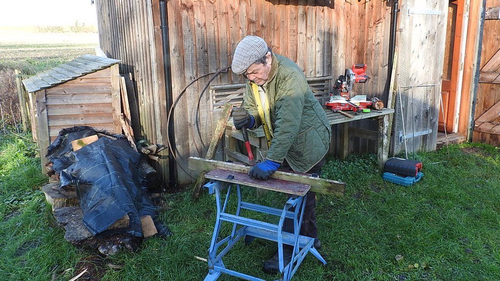 Eddie lit the fire and put sausage rolls in the oven above. We got the notice board frames and wood from an old pallet to make the log rack. Eddie pulled nails out and I cut the wood to length for the top and bottom to hold the metal frames in place.