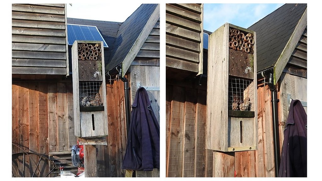 I brought over the insect hotel we made from a chutney box as the butterfly compartment was breaking up. I took it off the stand and removed the broken plywood, put extra screws in to hold it together and cut a small piece of wood to hold the front panel in place. I screwed the box back on the stand and put it back in the meadow.