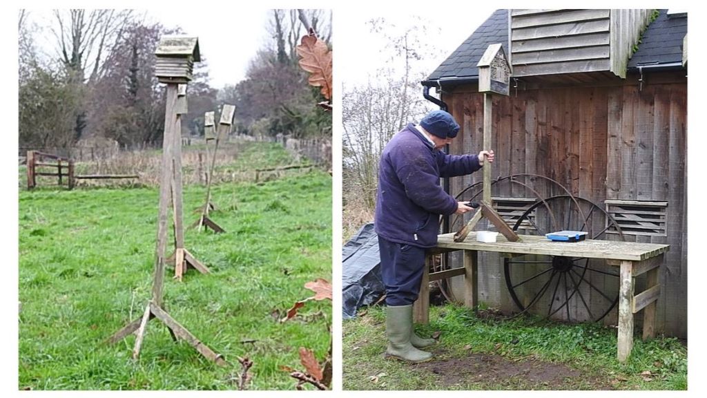 Our main job today was finishing and installing the blue tit nest box we made last week. I brought a 25mm drill bit as our drill set doesn’t have one, this is the entrance hole size that blue tits need. I drilled the hole in the front of the box and filed the edges smooth. Eddie fitted a metal plate to stop predators getting in, then painted water based wood treatment on the roof and I nailed roofing felt over the join to stop water getting in.