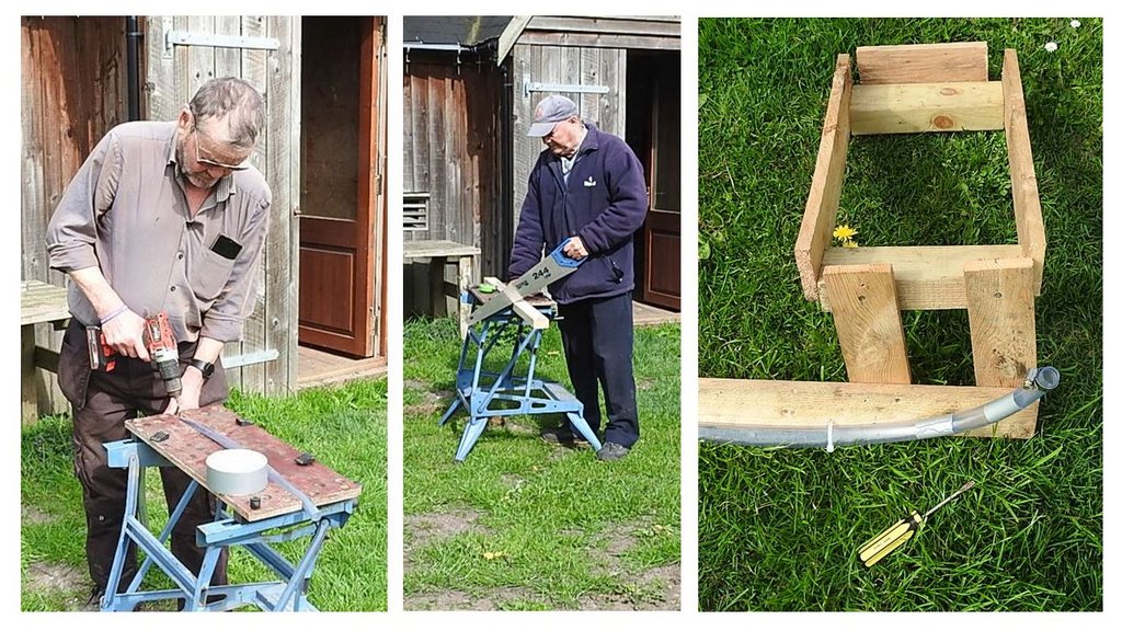 Eddie drilled a row of holes in the hose and I sealed one end with fittings and Duck tape. We made a wooden frame for the tank and fitted a plank to hold the hose, then drilled holes in the plank for fixing the hose to it with cable ties.