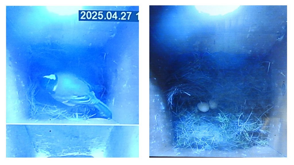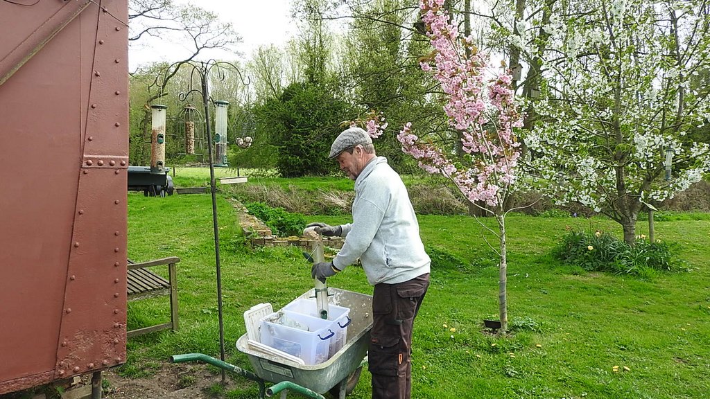 Last week I setup the trail camera pointing at the water wheel as we’ve seen wagtails around it and need to know if they are nesting in it, as this would prevent us turning the wheel at our open days on 9 & 10 May. I took the camera into the wagon and removed the card while having a cup of tea, I’ll take the card home and view the images. We switched on the nest camera and saw two great tit eggs, the female added more nesting material a few times, but we didn’t see the stock dove this week.