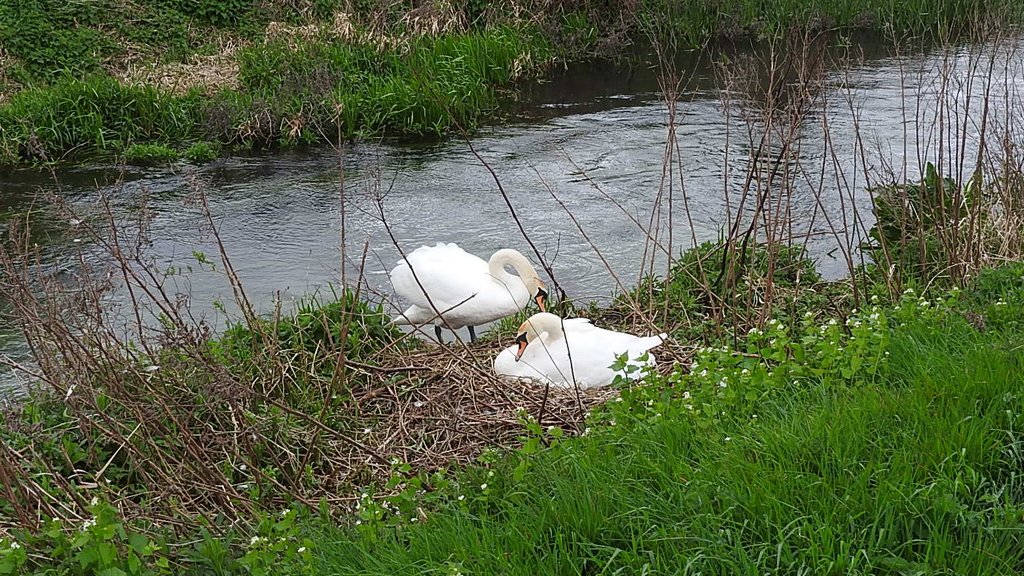 The male swan was in the river and the female was moving her three eggs around in the nest, they do this to regulate the temperature. Swans lay upto nine eggs over several days so there may be more to come, in 2024 we saw eight cygnets.