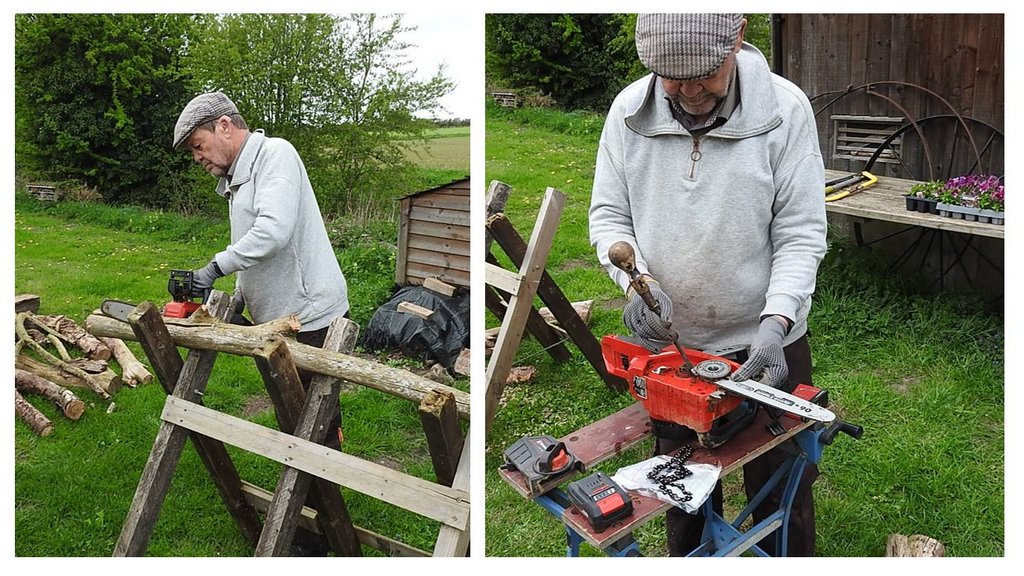 When we got back to the mill I got the saw horse out and we cut the logs small enough to fit our woodburner stove, we decided to fit the new chain on the saw as it was getting blunt, we also cleaned the chainsaw while we had it apart. It now cuts much better, we saved the old chain as we can sharpen it.
