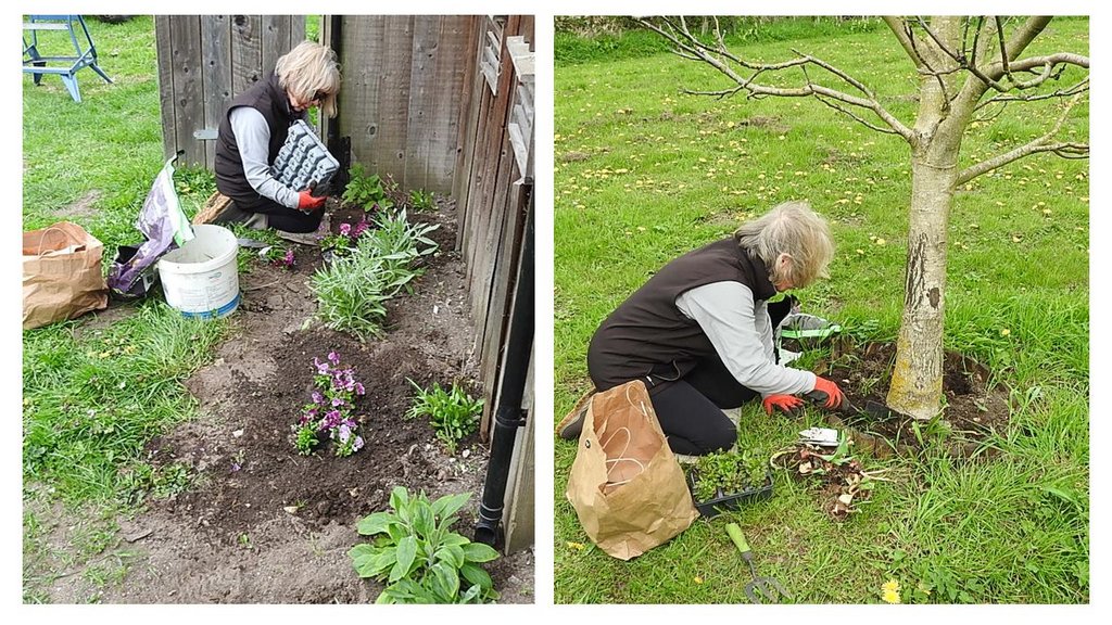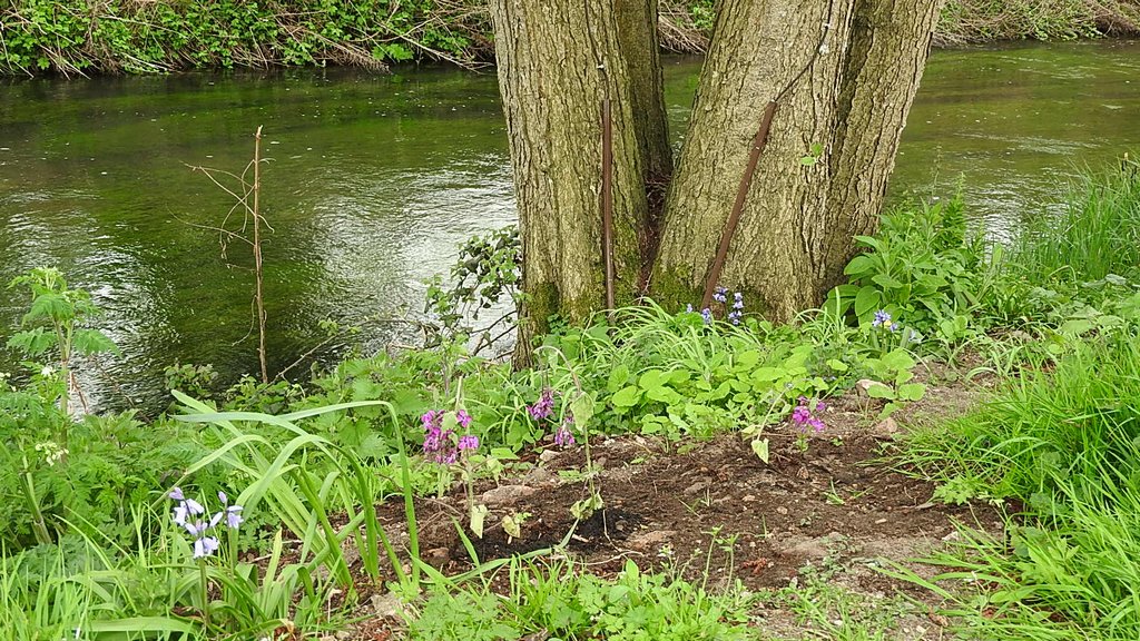 Anne Marie joined us and weeded the gardens, then planted Lobelia around a tree and Viola in the garden by the building, and watered them all in. Bluebells and honesty planted recently are in flower on the river bank as well as both of our cherry trees.
