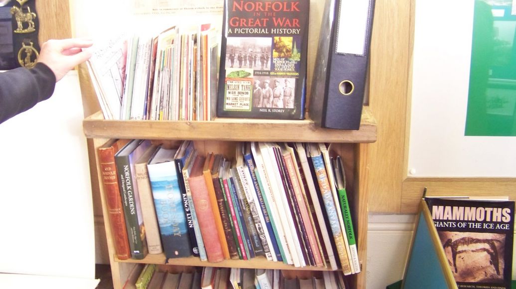 The shelf by the desk has also been started, this includes magazines and journals from the West Norfolk local history society, Norfolk Roots, Norfolk Museums, Sandringham Estate, Norfolk Fair, and photo albums of The Maltings fire and A47 bypass.