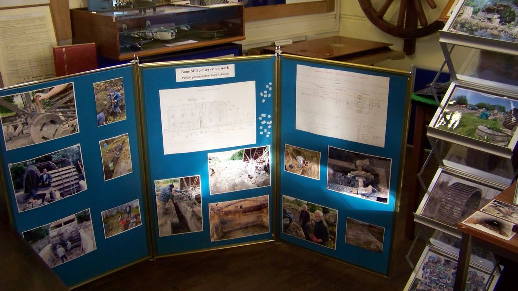 There is a large folding display stand with photos, sketches and plans of the bone mill, this is in addition to the finds display. A large bone mill website label was added to the display so visitors can find out further information.