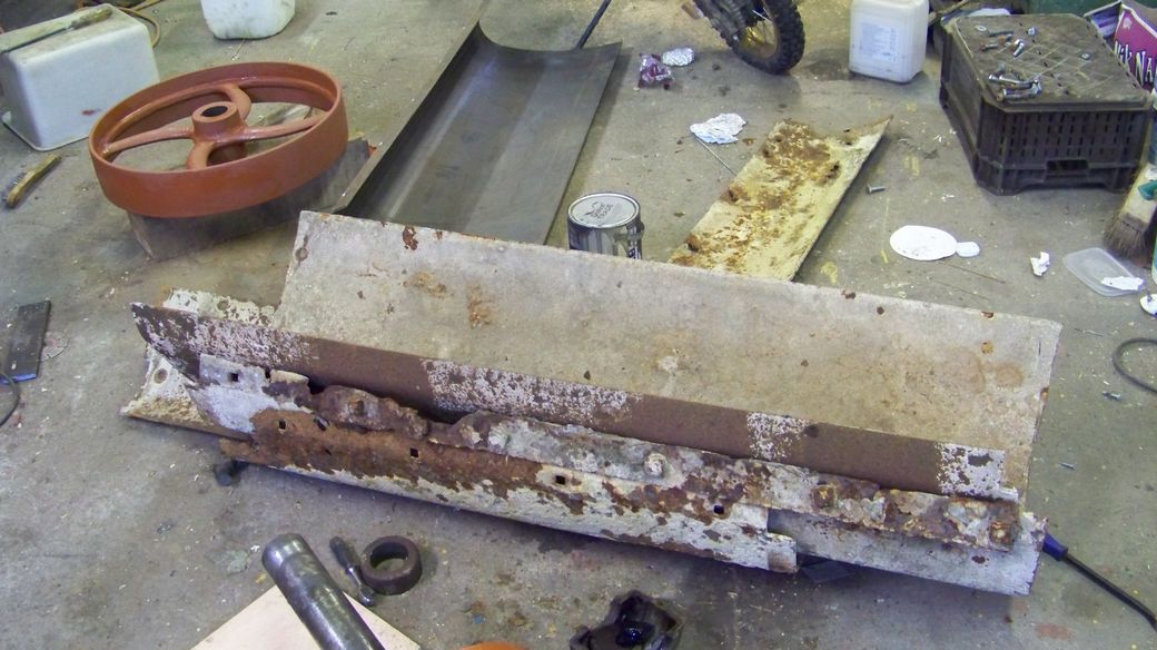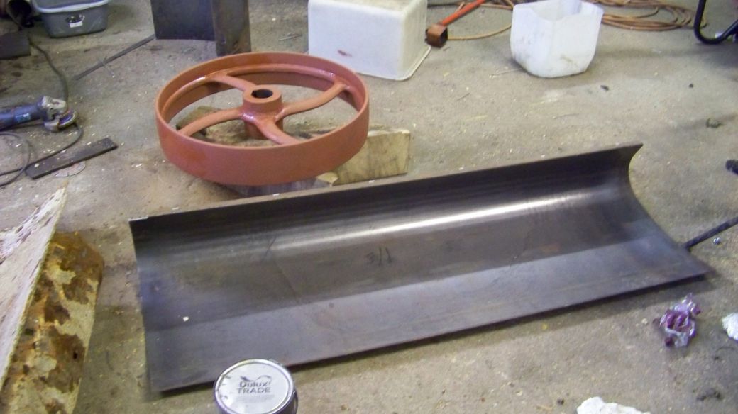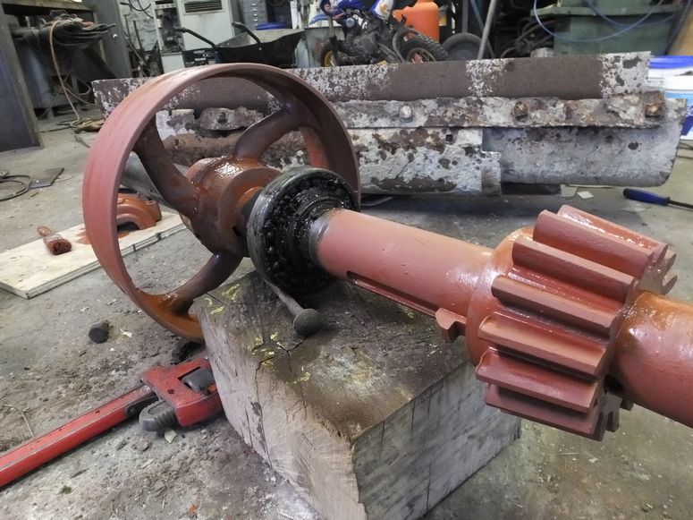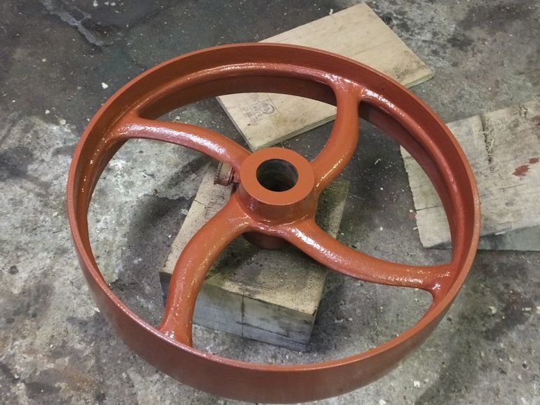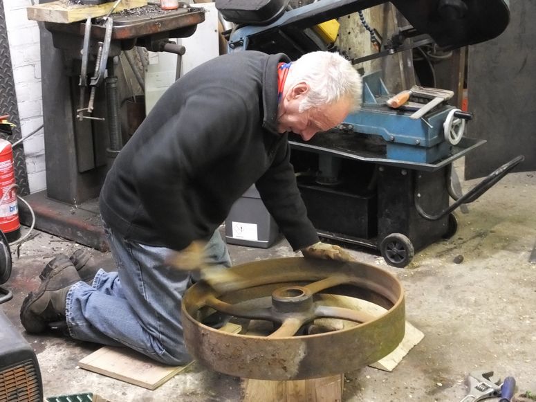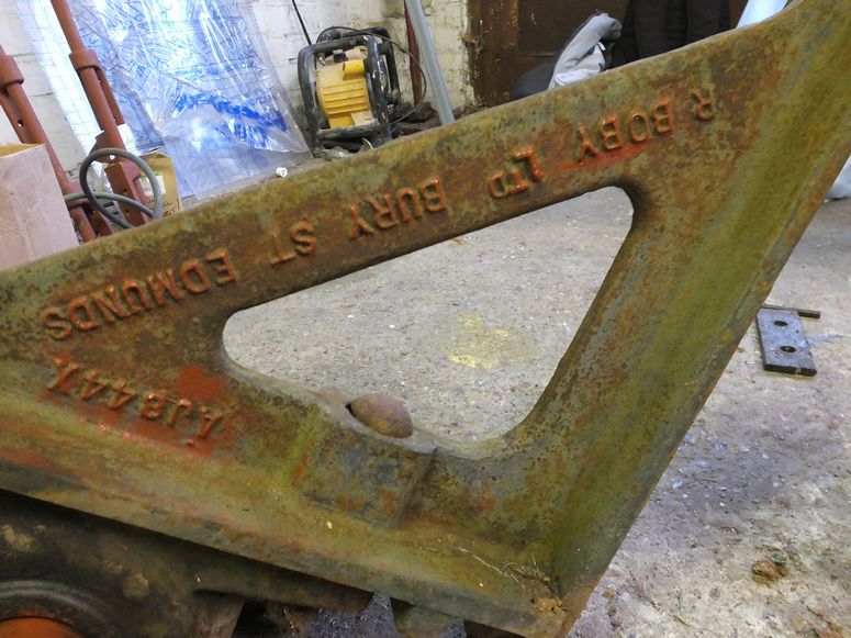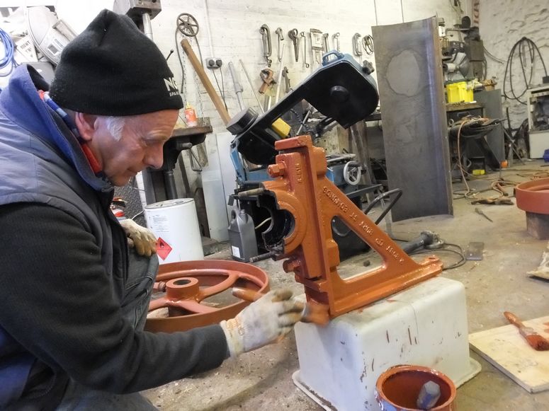 There were 4 volunteers today and as it was snowing in the morning we found some indoor jobs to do at The Maltings. There were some pulleys, a shaft and brackets in the workshop from The Maltings. These will be used to make a table and seat (with one of the old / spare water wheel paddles used as the main part), so they were rubbed down with wire brushes ready for painting. The name R Boby of Bury St Edmunds is cast into the brackets, they are a well known manufacturer of farming and malting machinery and there is plenty of information about them on the web.