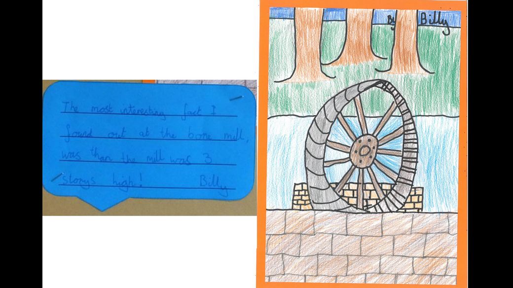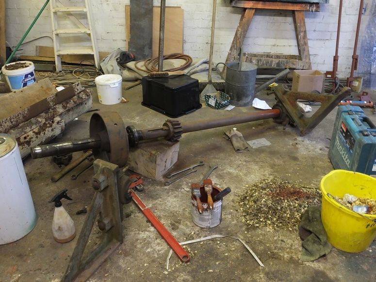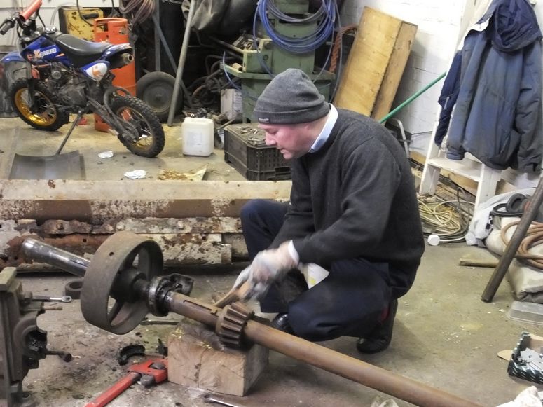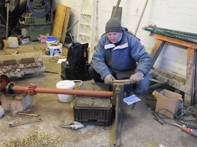In the afternoon the pulleys, shaft and brackets were painted with red oxide which was our final job of the day, these are for the bench seat we are making. Beryl brought us all tea and biscuits so we had a break and discussed various things including trying to encourage previous volunteers back again, and the school drawing of the bone mill competition, won by Billy who said his favourite fact was that the building was 3 storeys high. Dennis and Adam cycled to the mill recently to look at some twisted metal which Adam found and to secure the sheet coverings protecting the site from frost. Dennis said the track was very slippery, we all agreed we are looking forward to working at the mill again as soon as possible.