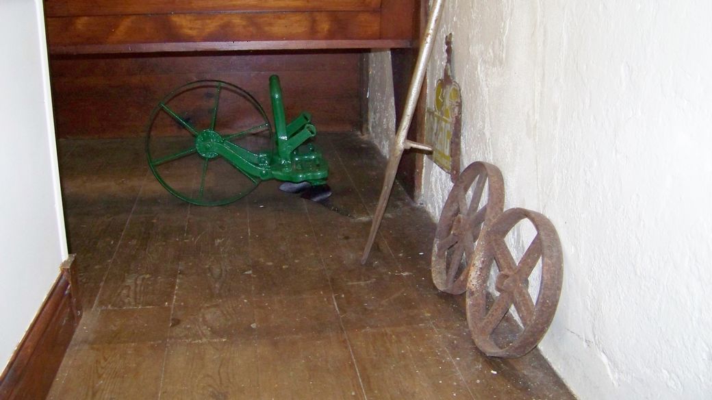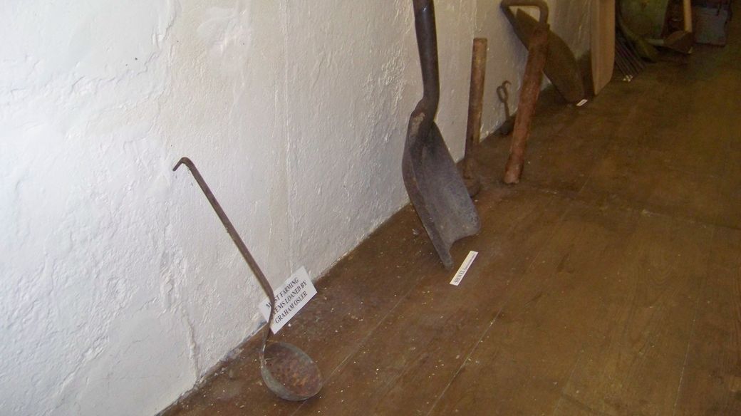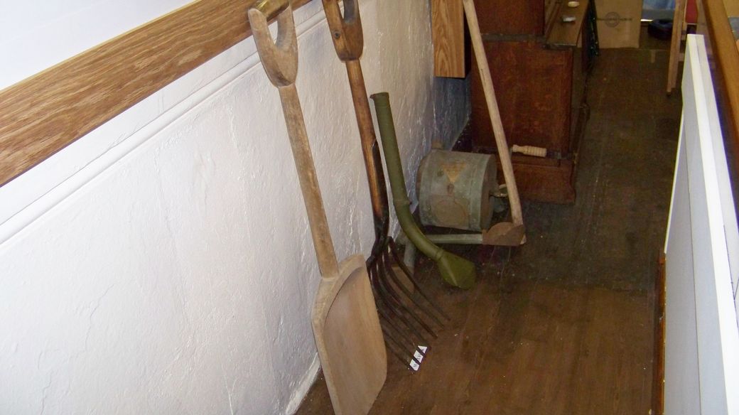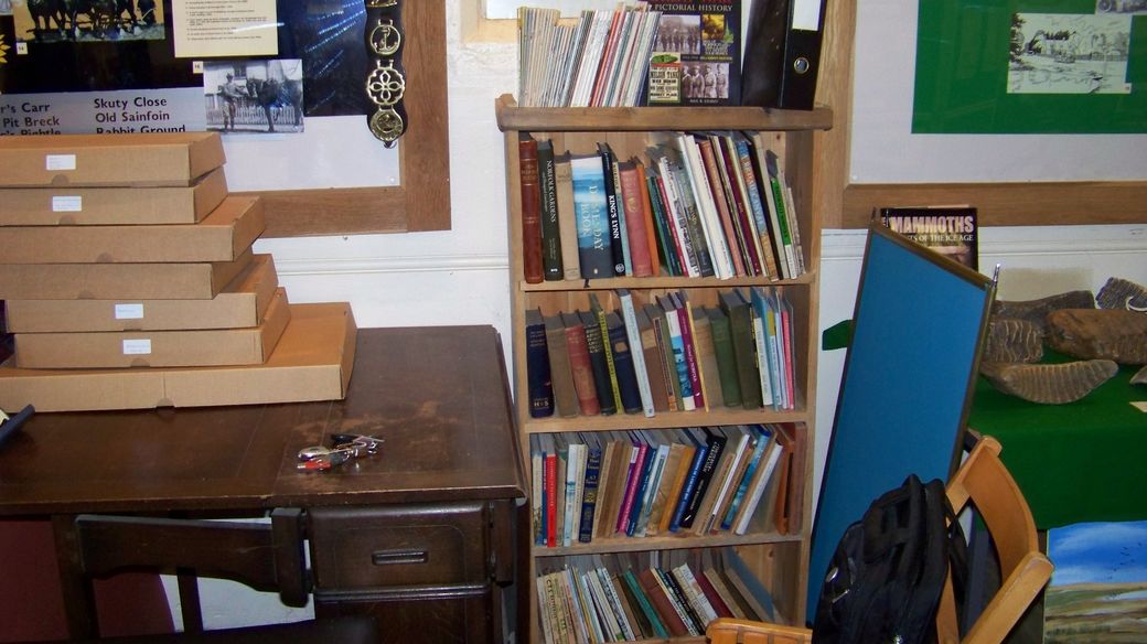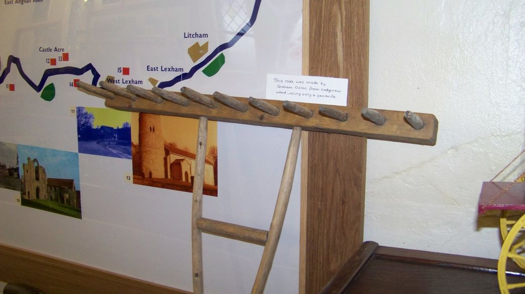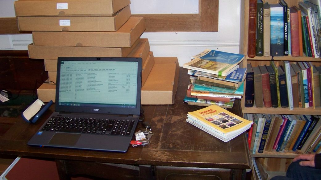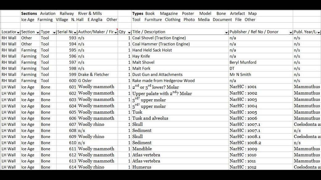 Later two of us went to the heritage center to finish logging books in the East Anglian section, this was completed and we added the Mammoth book to the list, which is part of the Ice Age section containing Mammoth and Woolly Rhino bones, tusks and teeth which were found in Pentney. Then we started logging the tools along the wall, most of which are on loan to the museum from Ozzie including a coal shovel and coal hammer for use on a traction engine, and a rake he made from hedgerow wood. There is also a hand cultivator, small cart wheels, and a dust gun with attachments for spraying crops. David gave me a disc of the ice age exhibits data which I have now merged into our main exhibits spreadsheet, so all museum records are now on one database.