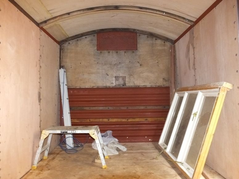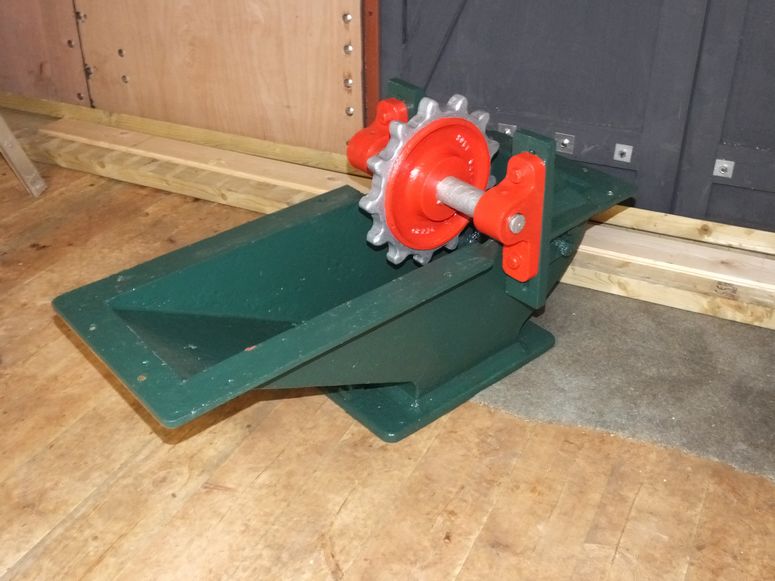 After lunch in the warm workshop at The Maltings, we went out and looked at the wagon which now has the doors painted all over and fitted. The ends of the roof have been sealed where water was getting in, and the bottom of the side panels has also been sealed with mastic. The elevator was briefly stored in the wagon and we had a look at it, now its painted it looks really good, the Ewart Chain lettering on the sprocket has been picked out and the colour combination goes well. Turning the sprocket wheel feels as if the elevator has been brought back to life. Also in the wagon is a window unit which we will fit into the wagon sides. A new set of door locks has been made and painted in the workshop ready for fitting to the wagon doors, a job for next time.