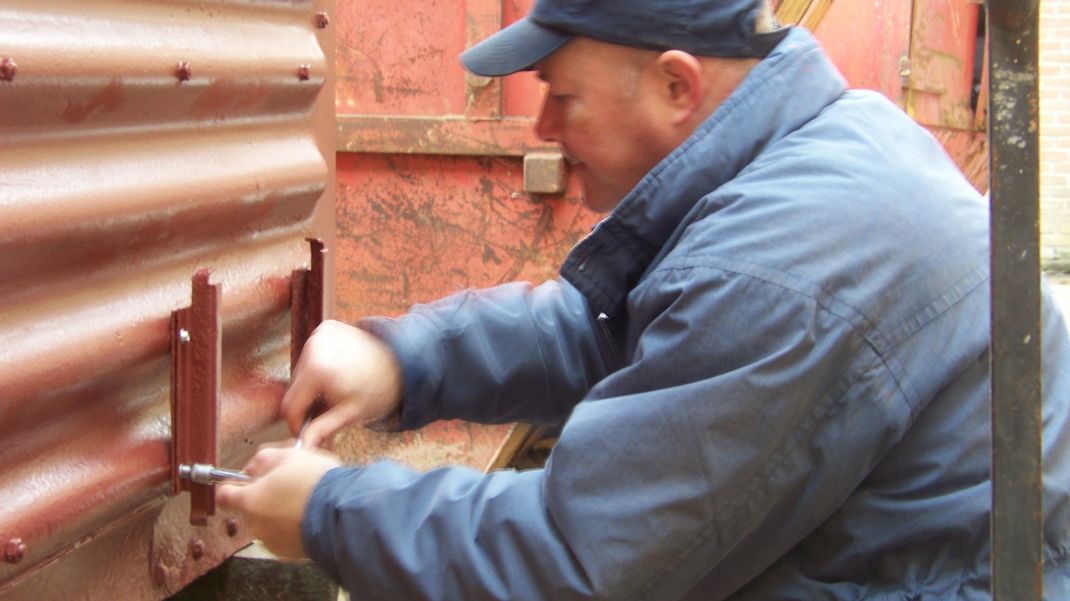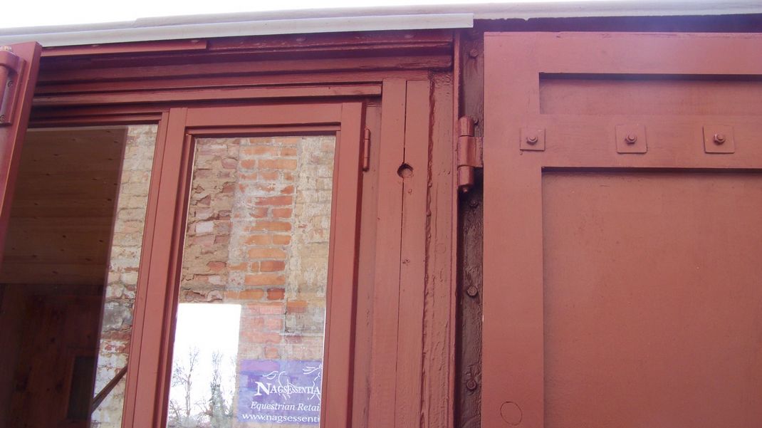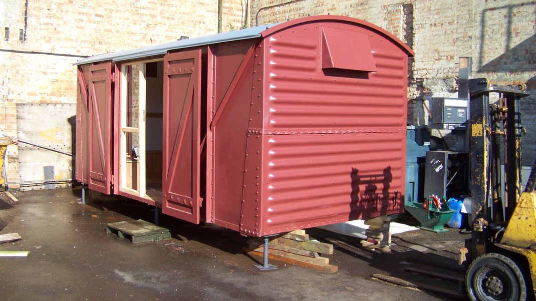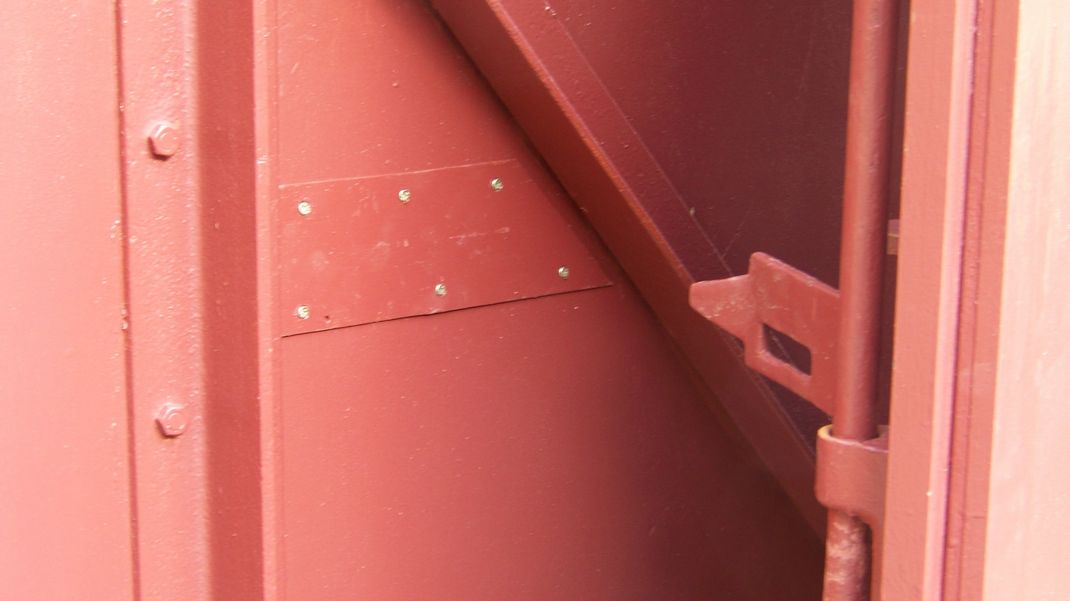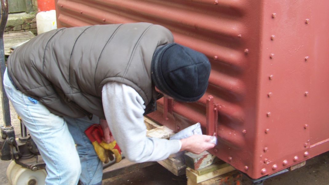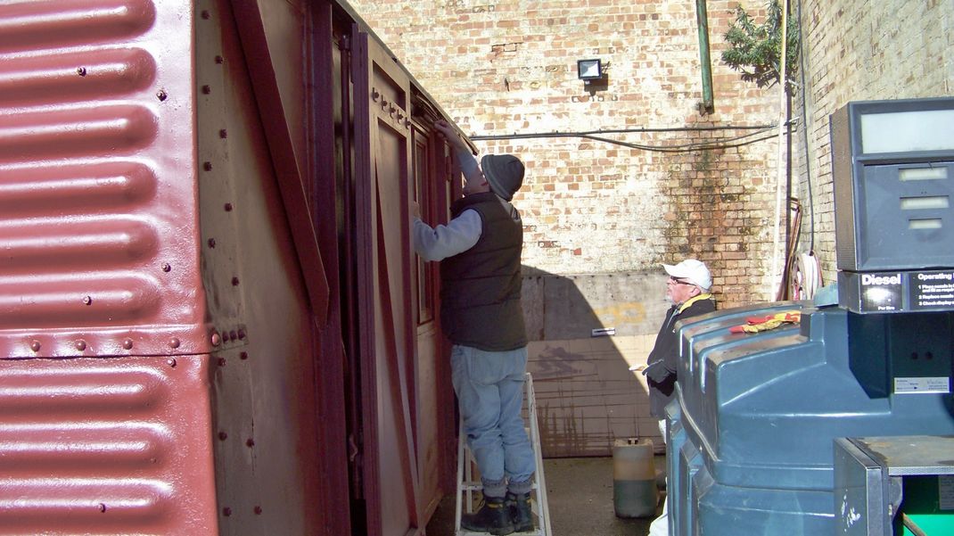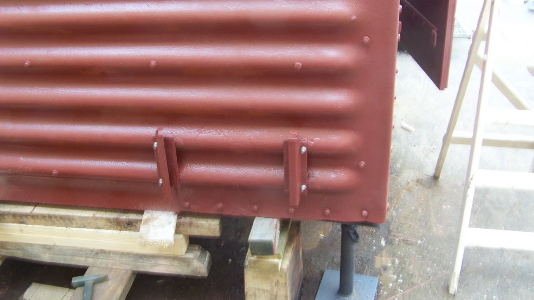 Back at the wagon, striking plates were painted and refitted to the outside, these protect the plywood sides from damage when the doors are fully opened. The cargo plate brackets had been removed so these were refitted.
