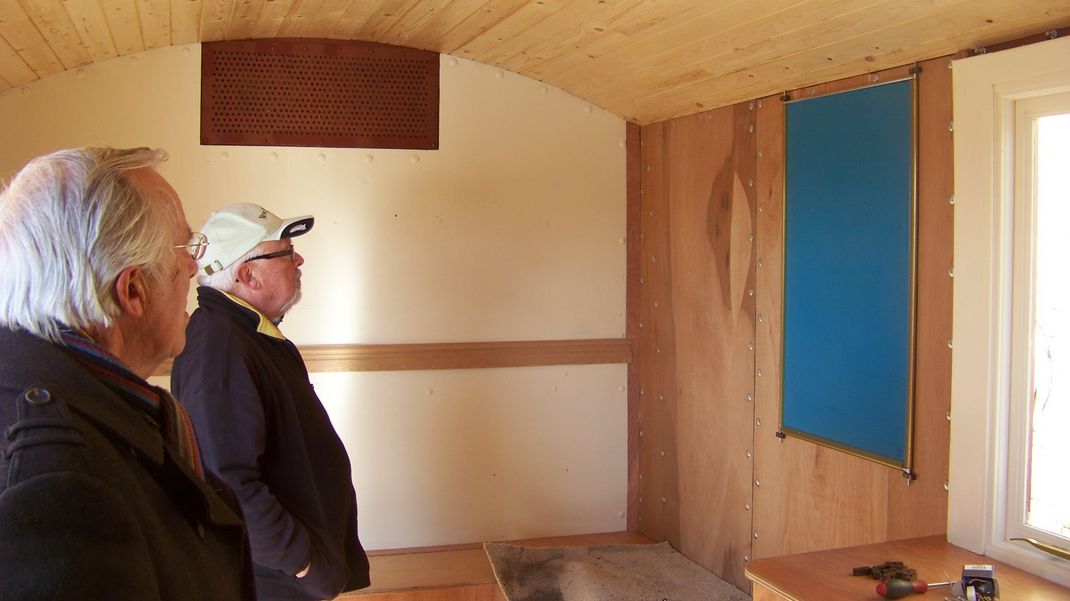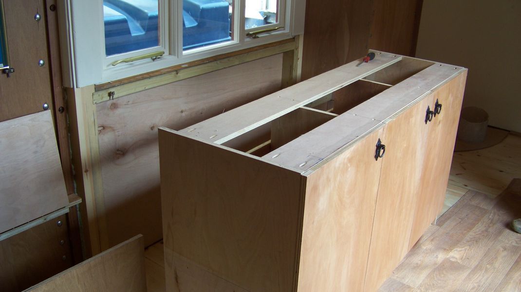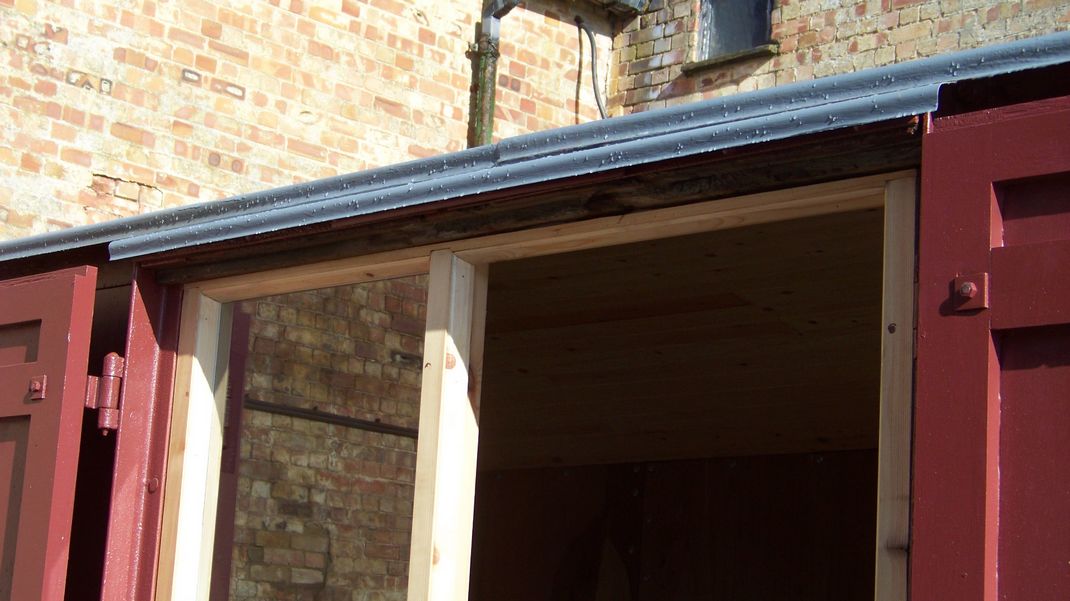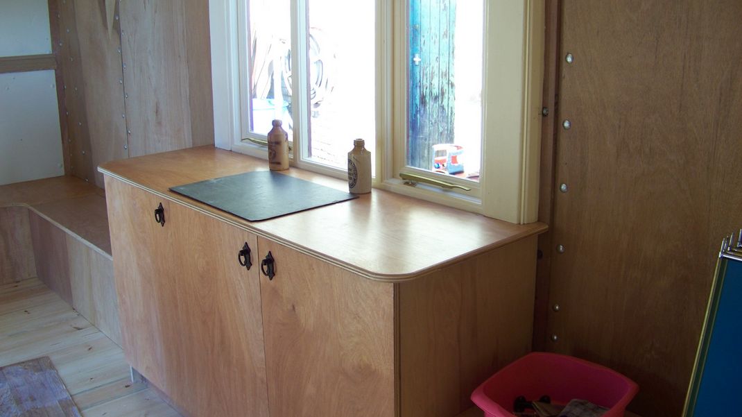 Last weekend several jobs were done on the wagon, mouldings had been fitted to interior end panels to cover the join between top and bottom boards, handles had been fitted to the kitchen unit doors, and a roof lip fitted over both sides of the wagon doors to keep water out.