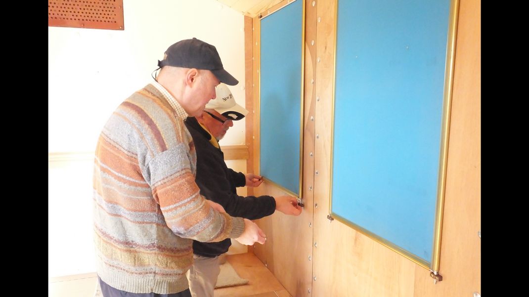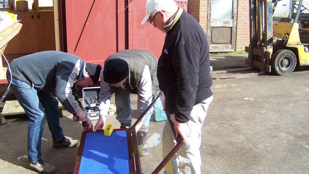 There were 8 of us working at various times today. We put up display panels on the walls, including a glass display cabinet. Fixing blocks were drilled out to secure the panels to the walls, and the glass cabinet was drilled and countersunk then fixed in place. The displays will be used for open days.