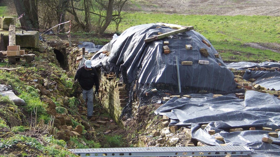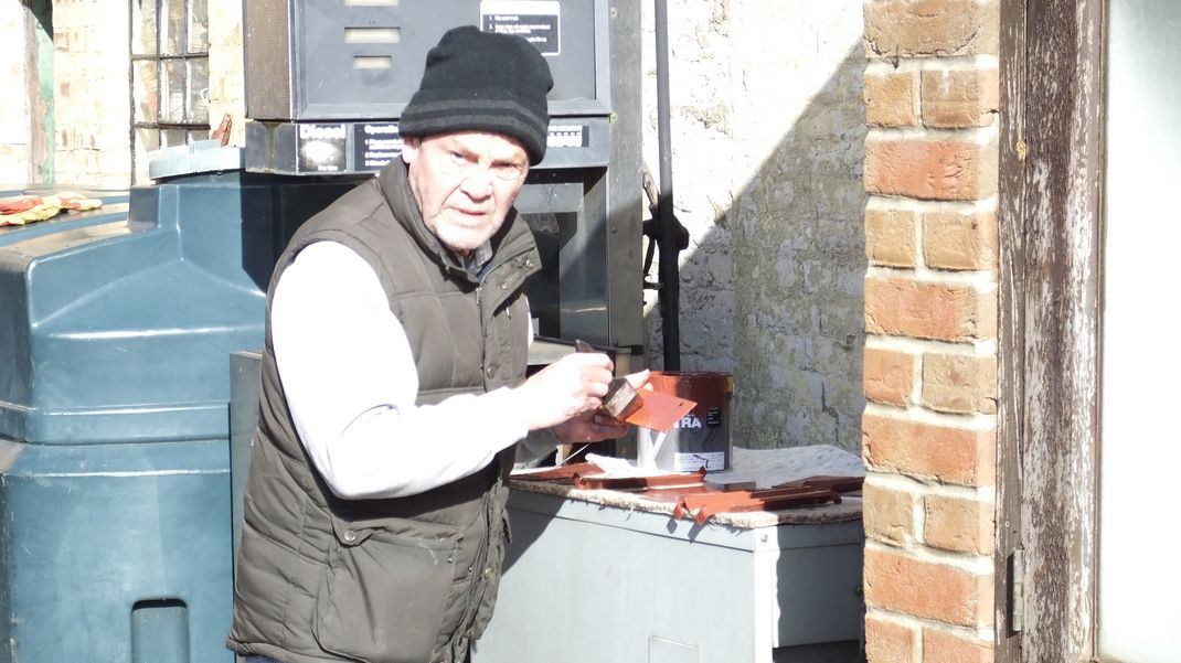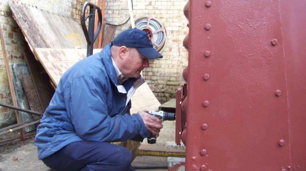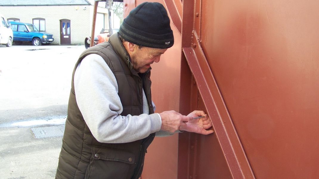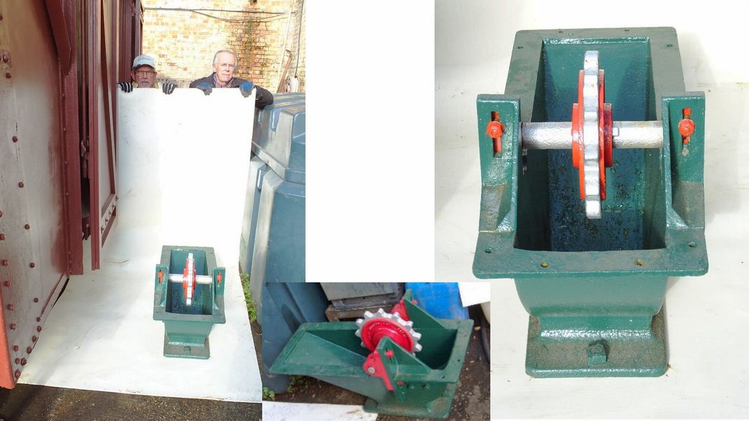 We counterbored the window frame to allow the main doors to close fully, disguising the holes by fixing bolt heads into them with sealant. These and several other areas were painted. The site became a photographic studio briefly, as we need a picture of the elevator against a plain background to put on our interpretation boards which will be on site at the mill and the opposite bank giving information about the bone mill and restoration project.