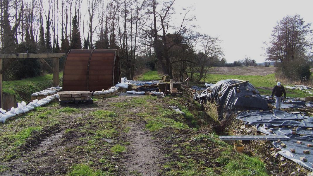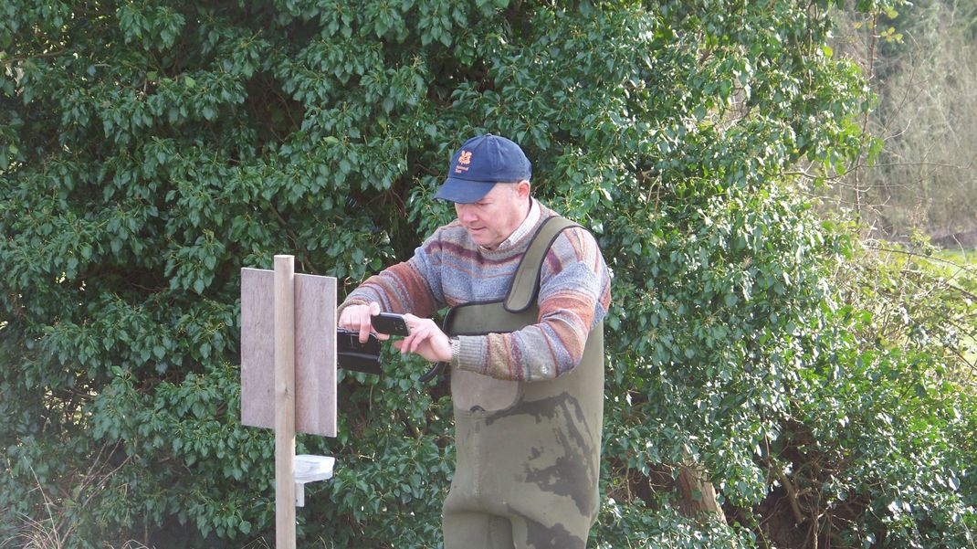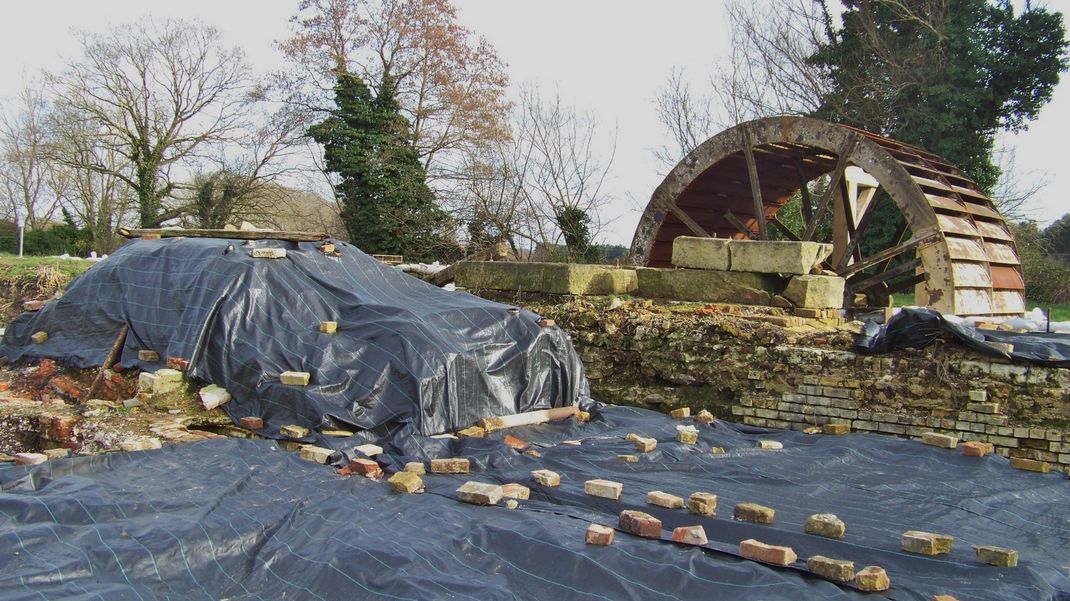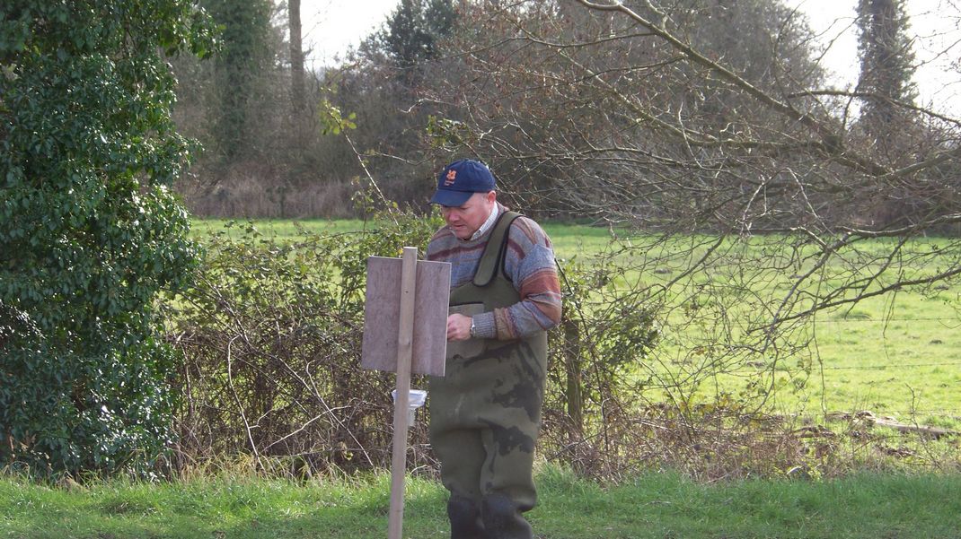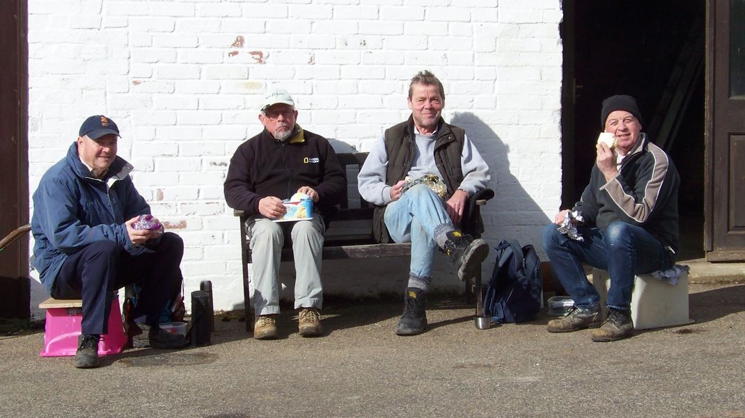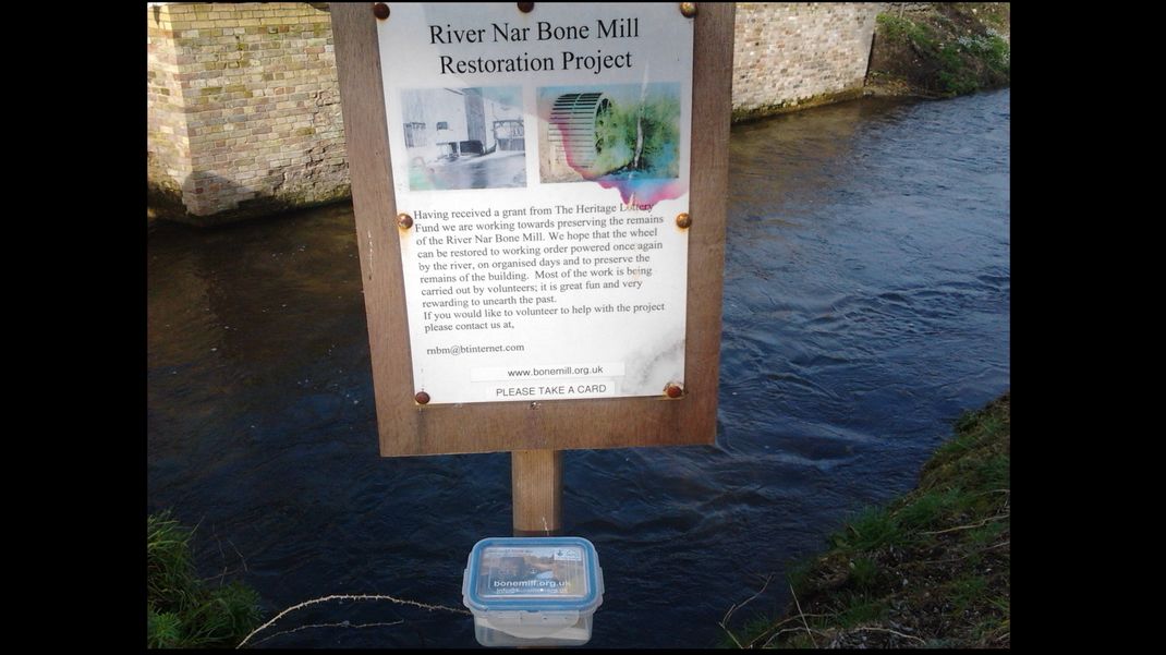 Lunch outside is becoming a tradition and today was no exception. In the afternoon two of us went to the mill with a label for the notice board to encourage walkers to take a card with the website address. This meant crossing the river again so we took waders with us. We covered up the hammer mill once more, as the sheet was loose again. Snowdrops were out on the river bank which gave a good view.