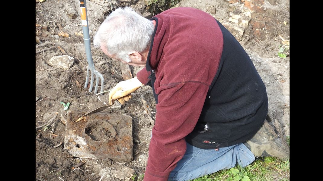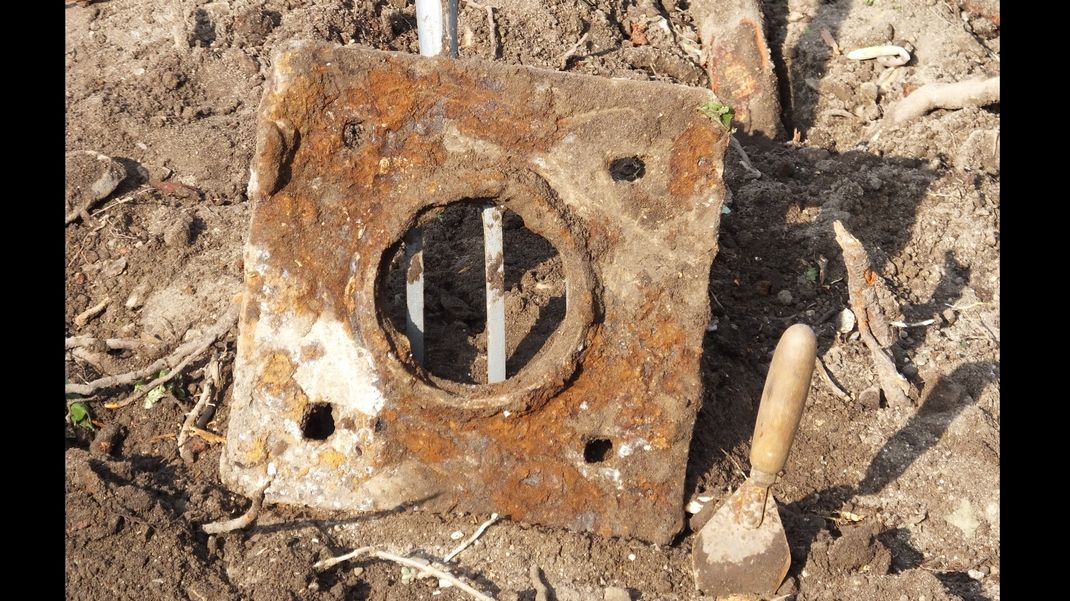 Tree roots were dug out and burned from where the tree was taken down and we explored the area. We found a square metal plate with a large central hole and four bolt holes, which looks like a machine mounting. We also found an eye-nail.