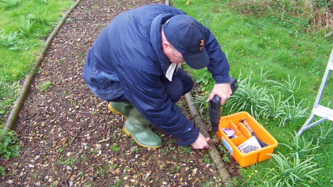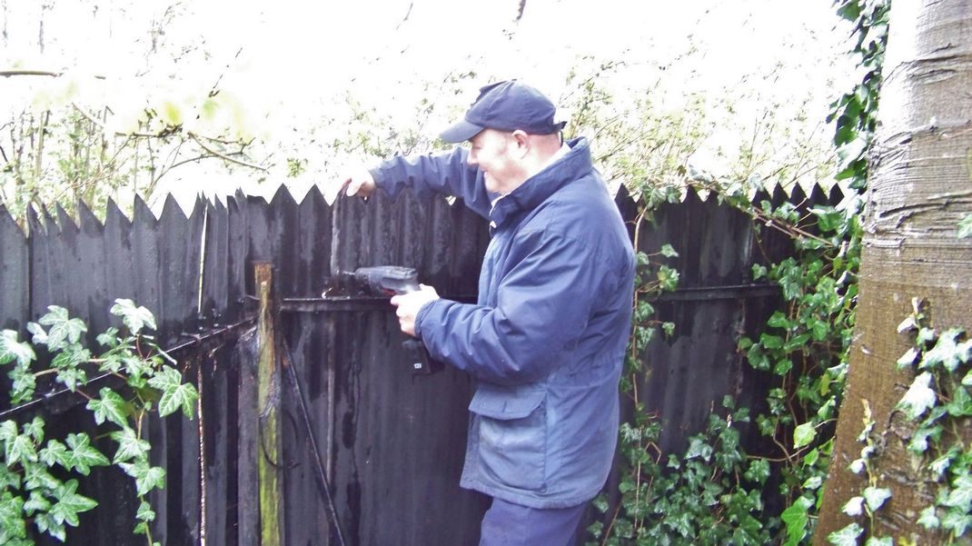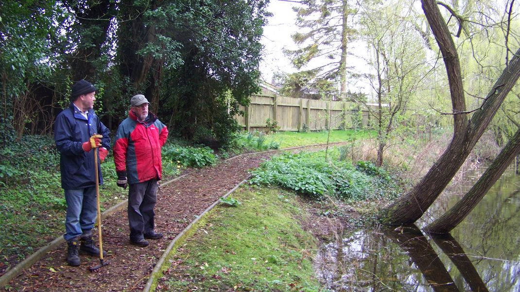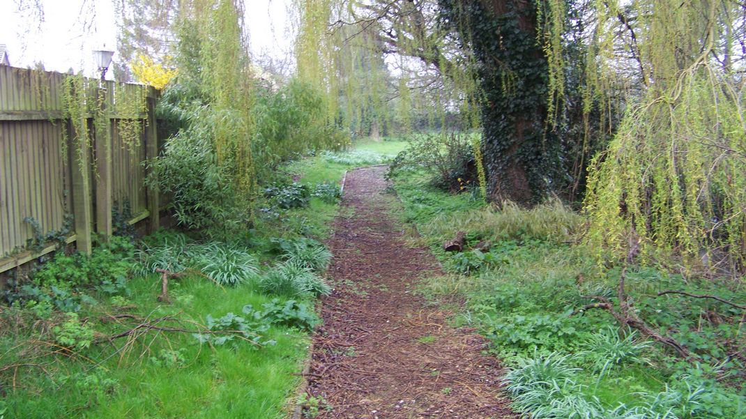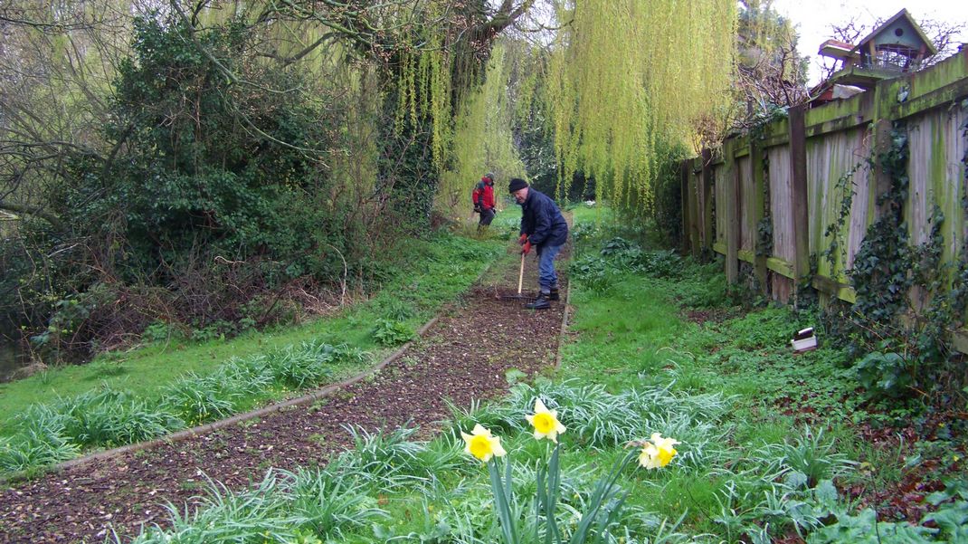 The metal fence bordering the footpath was broken in the corner so this was drilled and bolted together, and the wooden fence opposite was leaning over so this was reset and propped back upright. The tall Elder and Ivy in this area were cut down lower and put in the bushes to make a habitat area.