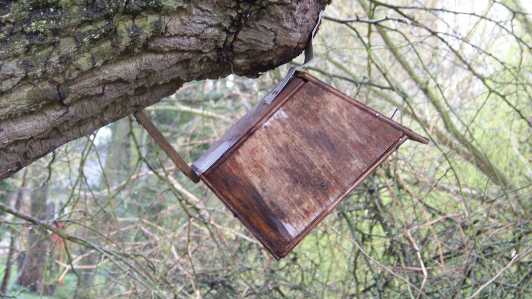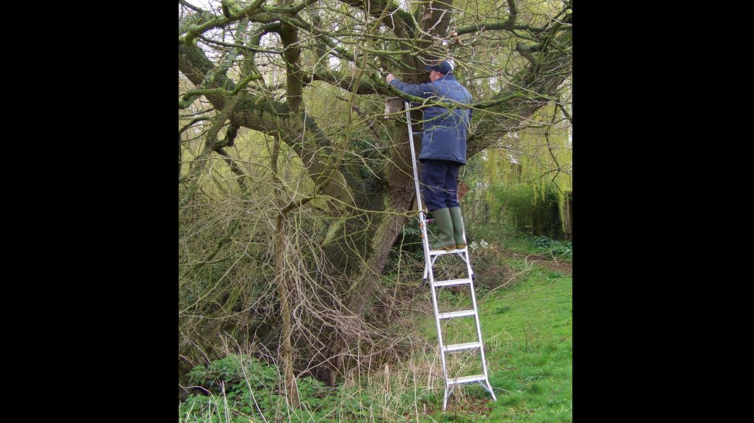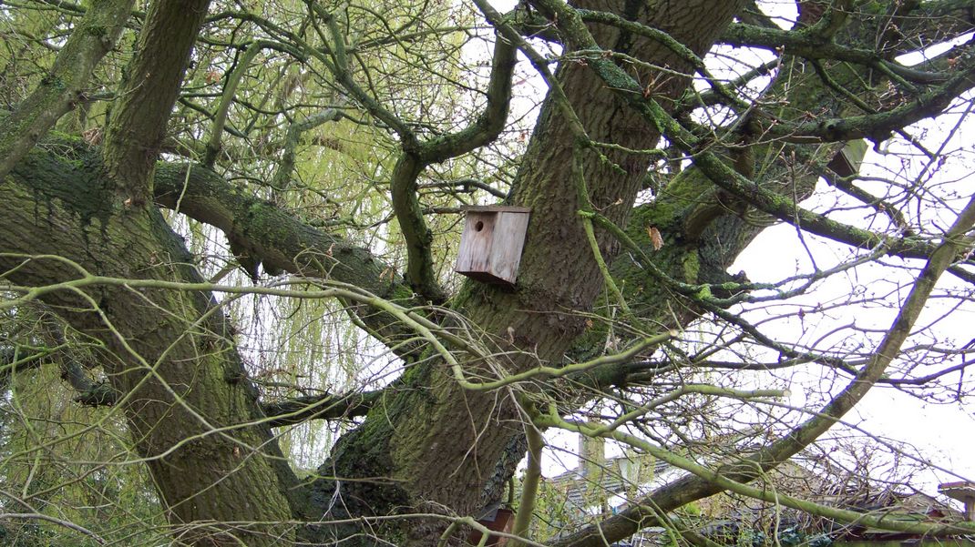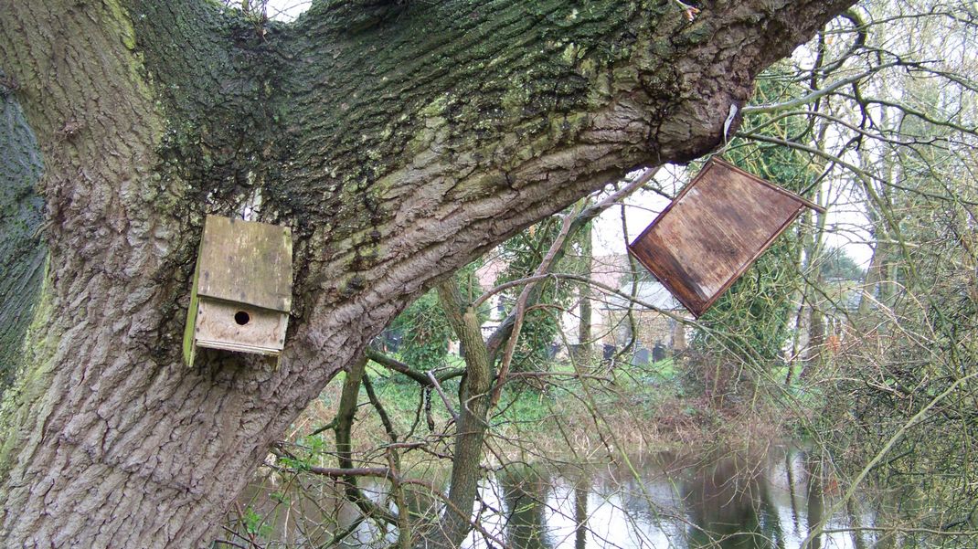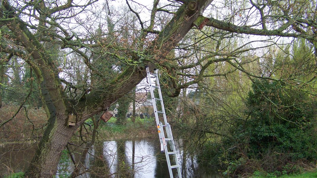 One of the nesting boxes by the pond was swinging loose so it was fixed at the bottom with a piece of wood and a new one was put up so now there are three nesting boxes for small birds. The bottom of one nest box is falling out, but the ladder would not reach high enough so it could not be repaired.