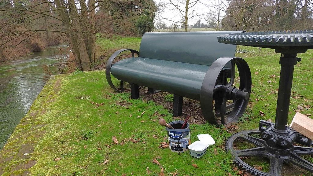 We cut a piece of wood to replace one which had rotted and fallen out, fitted it to the backrest and held it in place with pieces of sheet metal screwed to the wood, then refitted the back panel with new screws. Eddie then painted the new wood and side tables. Back at the mill we used up the last of the matt black paint on the wooden supports of our steel bench seat beside the river.