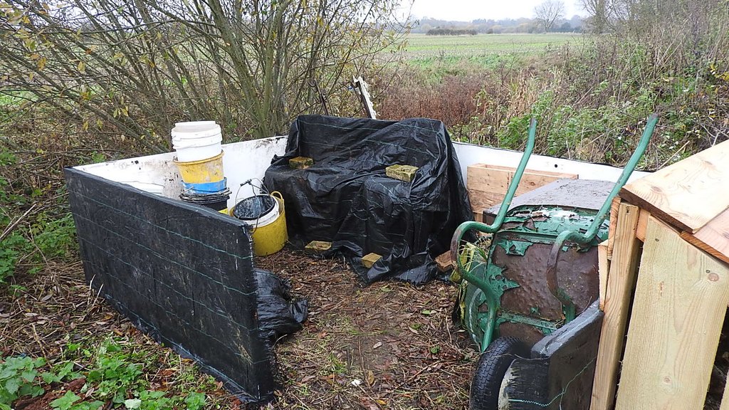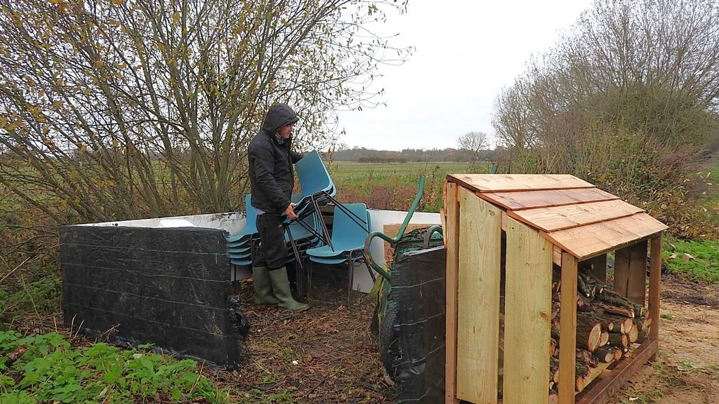 Our first job was sorting out the visitor centre loft, I went up and passed things down to Eddie, there were two wooden boxes which we'll convert into bird nest boxes. There were also lots of buckets and storage tubs which we put in the compound. I put metal and plastic stakes in the pallet which forms the compound wall, this keeps them tidy.