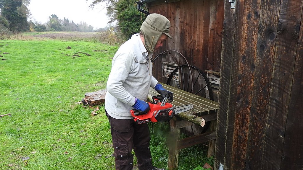 We had hot sausage rolls again for lunch in the warmth of the wagon. In the afternoon Eddie logged up branches which were cut from a tree to make room for the compound and I put them in the new logstore we made last week along with some of the logs stored outside which Eddie brought over.