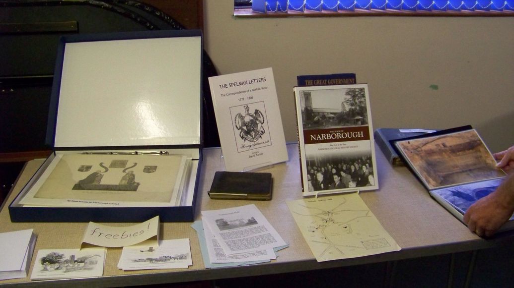 David brought many items which were put on display which we viewed after the presentation, these included books by David – The Book of Narborough, and The Spelman Letters. Also on display were old photograph albums, letter books, an old map of the village, photographic record of the bone mill project, a file of ancient documents and a supply of free items including notelets with scenes from Narborough and leaflets with the history of Narborough Hall.